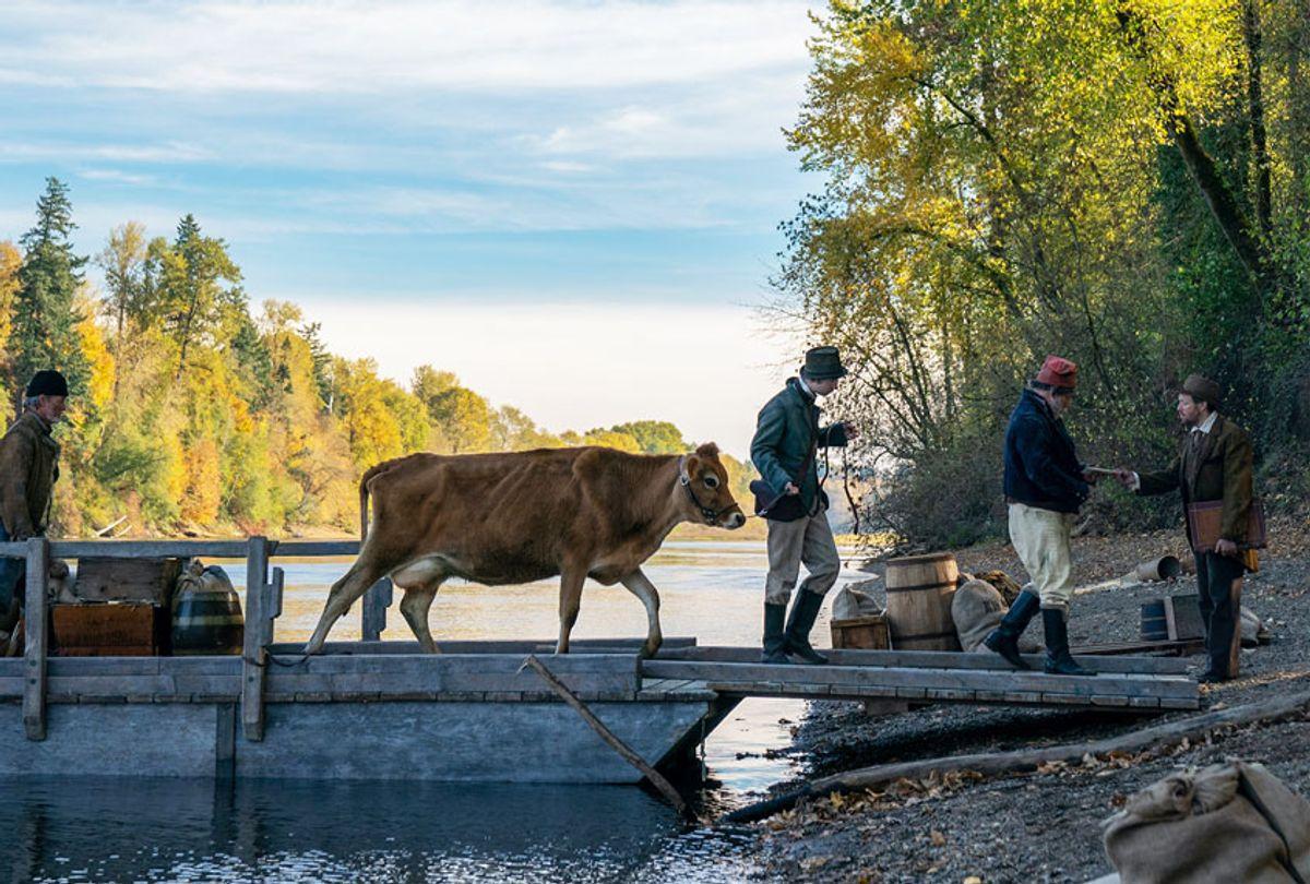 Society’s improved understanding of animals’ lived experiences appears to be translating into growing consideration of their needs on set, sometimes even ahead of those of their human costars. Kelly Reichardt’s First Cow follows two scrappy entrepreneurs in 1820 Oregon—hence the first cow of the title, who belongs to a rich trader in town and arrives by way of a wooden dock across a river. The director considers the film a heist movie because the two main characters regularly steal milk from the unattended cow in the middle of the night in order to bake their sought-after donuts. But this isn’t a smash-and-grab type situation: Cookie (John Magaro) is respectful, greeting the cow each time, acknowledging the death of her calf and her mate, and softly squeezing milk out as he whispers, “What a good, sweet girl you are.” Later, when she is standing near him in front of the trader, who is unknowingly introducing them, she sniffs and licks him affectionately—they have a bond that the cow and the trader do not.