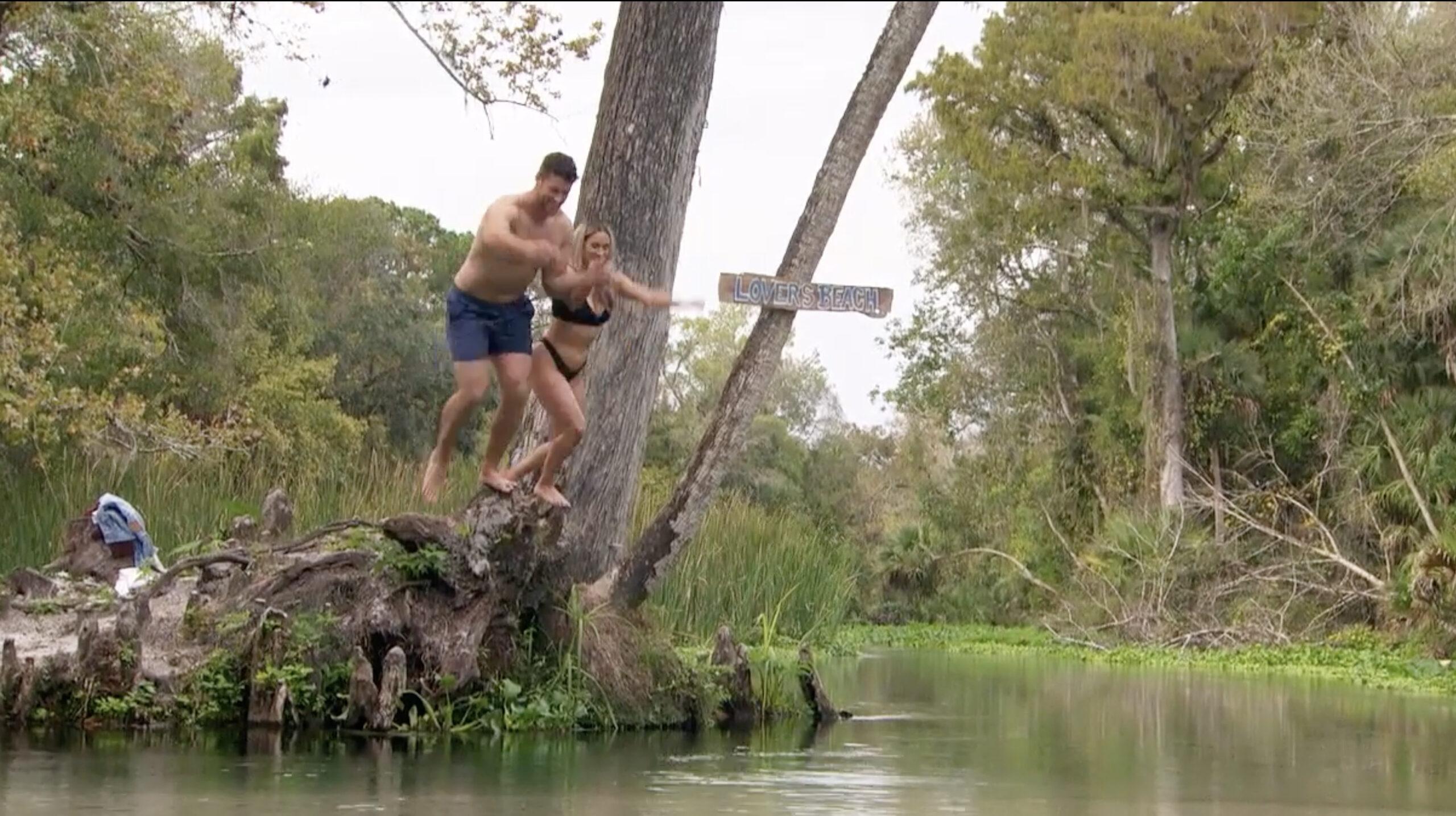 So The Bachelor took matters into its own hands. On two of Clayton’s dates, he explores nature with his potential partners: In Florida, Rachel takes Clayton on a clear-bottomed kayak tour, supposedly to show him the horrifying fauna of Florida, which don’t cooperate. (They see a spider—no gators.) In Denver, Gabby and Clayton go hiking in the foothills of the Rockies. And as fate would have it, both jaunts feature signs indicating local landmarks dedicated to love. Gabby and Clayton find “Proposal Rock” up in the mountains, and Rachel and Clayton row up to the “Kissing Tree” of Clermont, Florida, luckily located right near “Lovers’ Beach.”