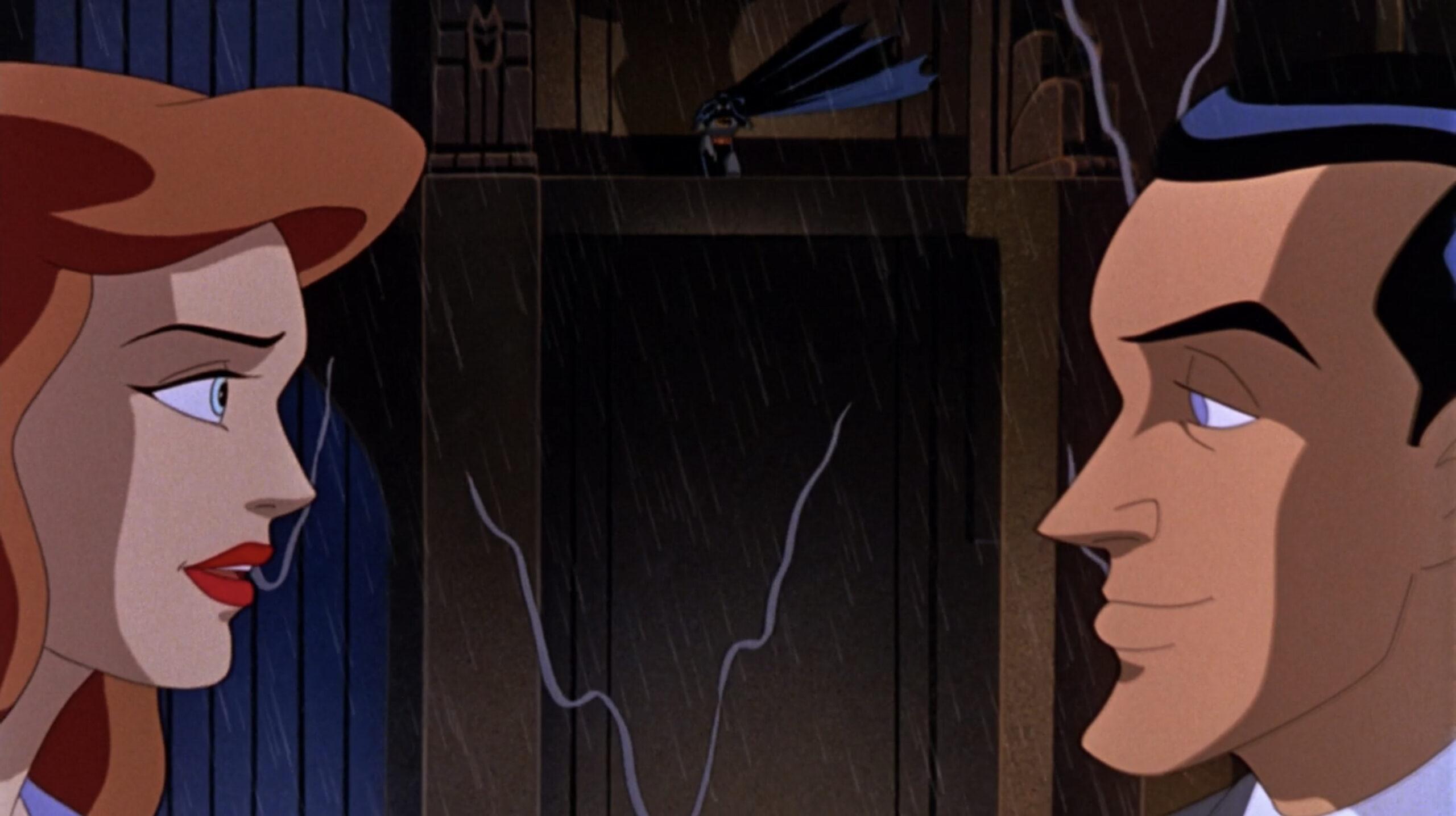 Outside of the more self-aware comedic takes on Batman, like 2017’s The Lego Batman Movie, Bruce has been more likely to be seen pulling up to parties via helicopter, surrounded by beautiful women, than he has to be presented as a sad “weirdo.” He’s often able to alternate between his dual personas as a crimefighter and a man about town, turning his dark side on and off as easily as if he were flipping a switch. But Mask of the Phantasm dedicated time to showing Batman perched along the edge of a skyscraper on a rainy night with binoculars in hand, watching as his former flame eats dinner with a new man: