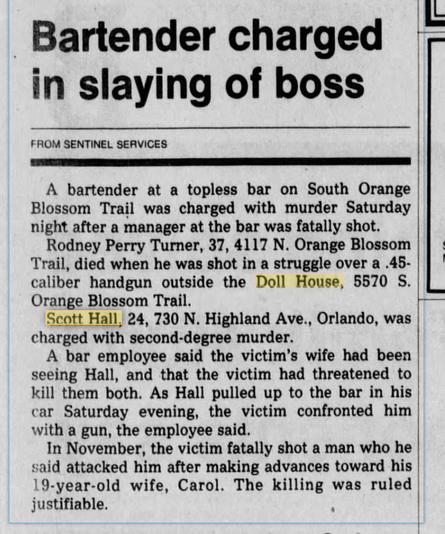 What the documentary did not do—but what the Orlando Sentinel did at the time—was provide richer context for the vicious attack, which was determined to be an act of self-defense. In an article published on January 16, the Sentinel reported that the man who attacked Hall was Rodney Perry Turner, the 37-year-old manager of the bar whose 19-year-old wife Hall had allegedly been seeing on the side. Turner had a history with justifiable homicide, with a Sentinel article from December 14, 1982, describing an incident when he fought off two men, one of whom who had assaulted him and made unwanted advances toward his wife before killing one of them, another violent killing ruled justifiable.