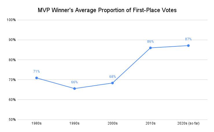 But regardless of the reasons, the fact remains that no MVP runner-up has finished with even half as many first-place votes as the winner in 15 years. Let’s look at the closeness of results another way: By calculating the average proportion of first-place votes the winner receives in each decade, we clearly see that the vote is more unified now than ever before.