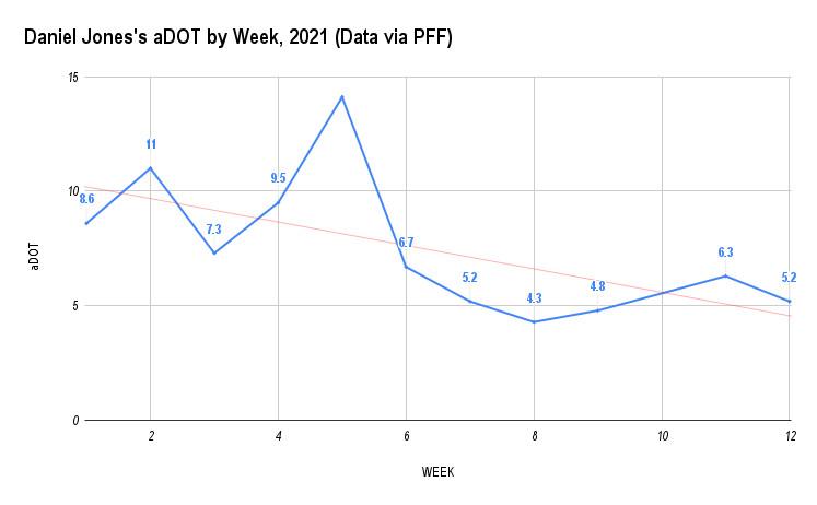 And you had to look hard, because Jones didn’t make many explosive throws downfield to pad his numbers. PFF credited him with only seven “big-time throws”—defined as “a pass with excellent ball location and timing, generally thrown further down the field and/or into a tighter window”—and his big-time throw rate of 1.8 percent was among the worst marks in the league. It was also a career low for the 24-year-old.