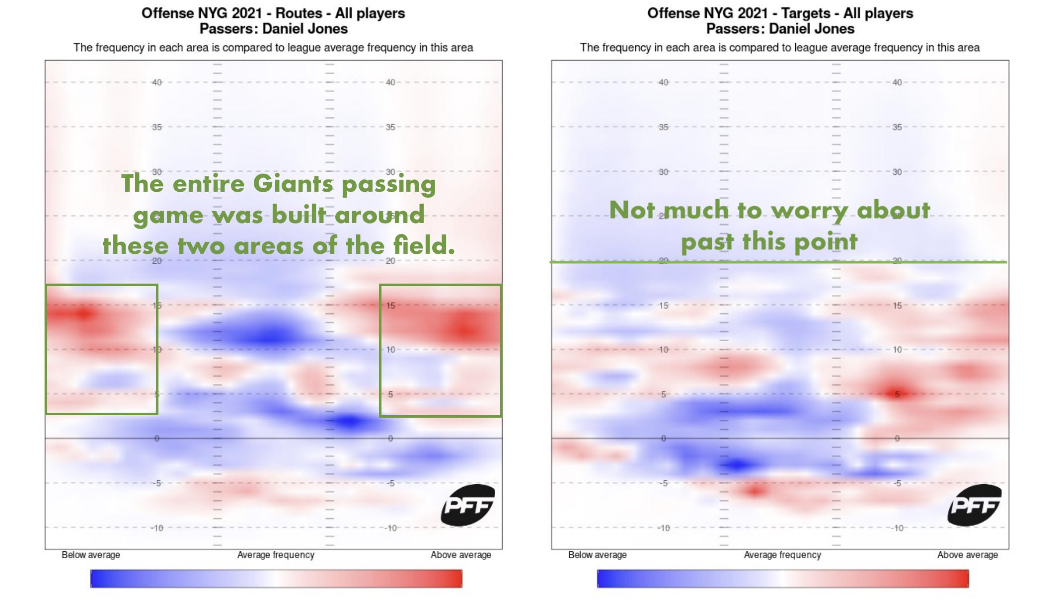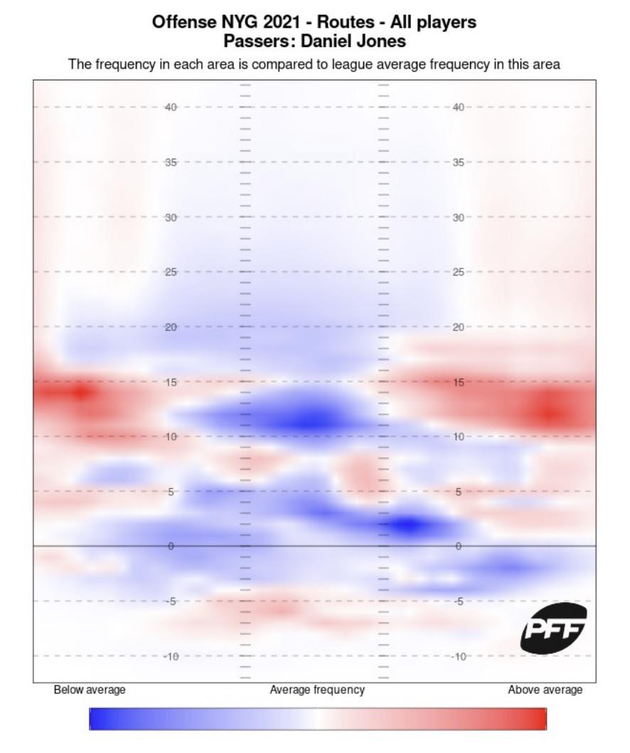 But as we covered earlier, the dearth of downfield shots was mostly a product of the offense. Only 6.6 percent of Jones’s passes traveled more than 20 yards downfield, for a rank of 37th out of 37 qualified passers, per PFF. Had Mike Glennon, who started four games for the Giants while Jones was out with a neck injury, thrown enough passes to qualify, he would have ranked 35th with a 7.8 percent rate. The Giants just didn’t produce the downfield opportunities. And if we revisit the heat map of the routes run for Jones in 2021, you can see why: