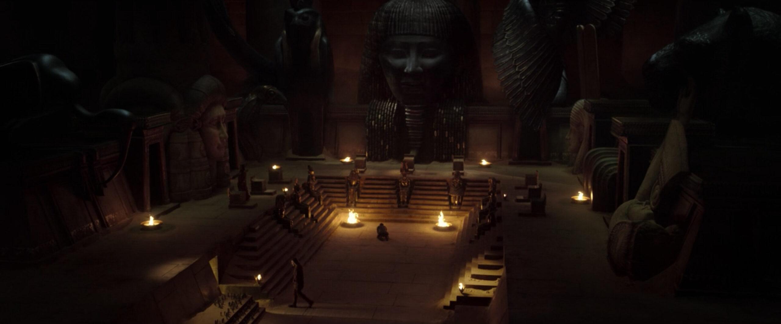 Given how impressive the production design looks inside the Great Pyramid of Giza, along with the gravity of meeting ancient gods, the scene itself is somewhat disappointing and uninspired. As Khonshu answers to his angry contemporaries and calls upon Harrow to answer for his conspiracy to free Ammit, the gods themselves are presented as their human avatars, undercutting the excitement and allure of featuring the gods in the first place. The whole sequence feels almost procedural in its attempt to move the plot along, and Khonshu and Marc are also frustratingly unprepared to lay out their case against Harrow. (Harrow’s Mandarin might leave a lot to be desired, but the guy would apparently make for a decent lawyer in light of the quick work he makes of Khonshu and Marc.)