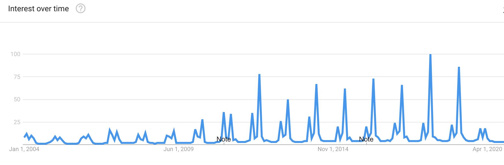 Admittedly, Google Trends isn’t the most scientific way to gauge interest in something, especially a festival that began before the widespread use of social media. But it’s useful to see the peaks and valleys of interest over a long enough timeline. Look at the graph below for searches of the word “Coachella”: