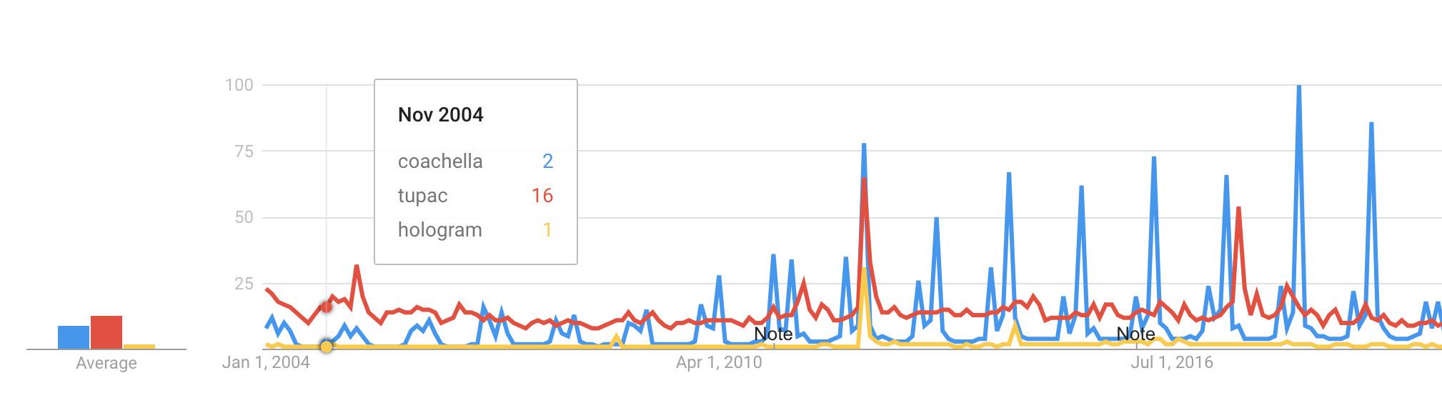 You’ll notice that the first major spike came in 2012. And surely there were many contributing factors: That year marked the first year the event was held over two weekends; it was the second year Coachella broadcasted a livestream of the event; Avicii, Swedish House Mafia, and the dubstep-industrial complex descended on the desert at the peak of the EDM era; Instagram had also just exploded in popularity and was helping turn the festival into an influencer haven. But look what happens when we also search for the word “Tupac,” shown below in red.
