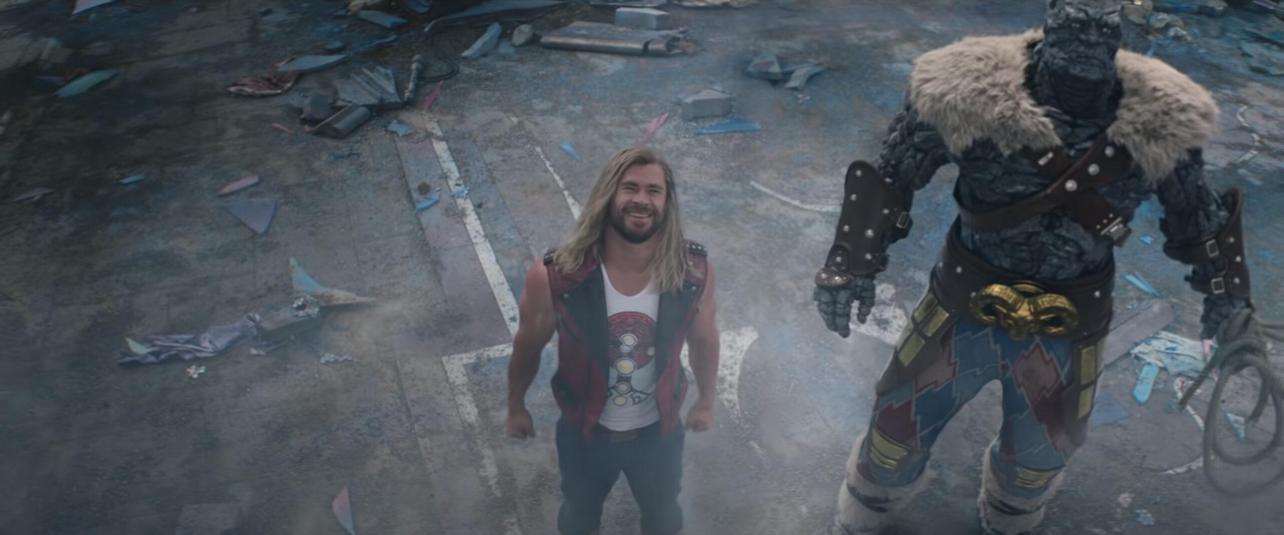 Along with the Guardians, the Love and Thunder teaser features glimpses of Valkyrie, as she suffers through a conference about renewable energy while wearing a business suit, as well as the one-and-only rock gladiator Korg, who, like Thor, has made some bold wardrobe changes that may be a better fit for a “Sweet Child O’ Mine” music video: