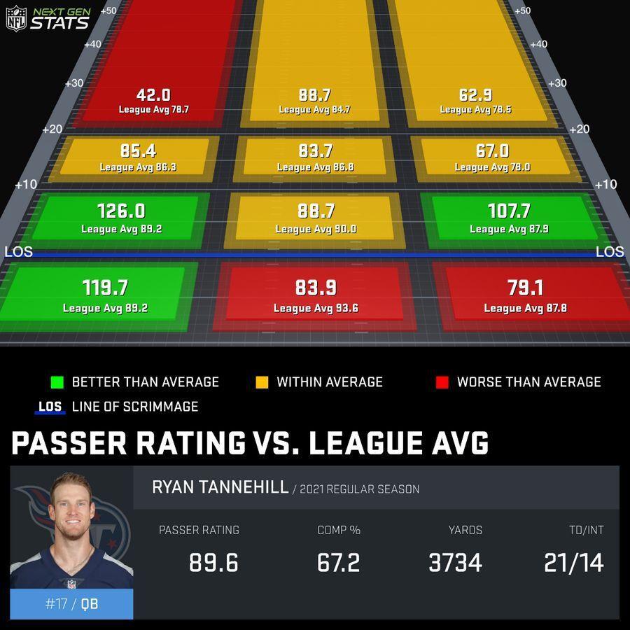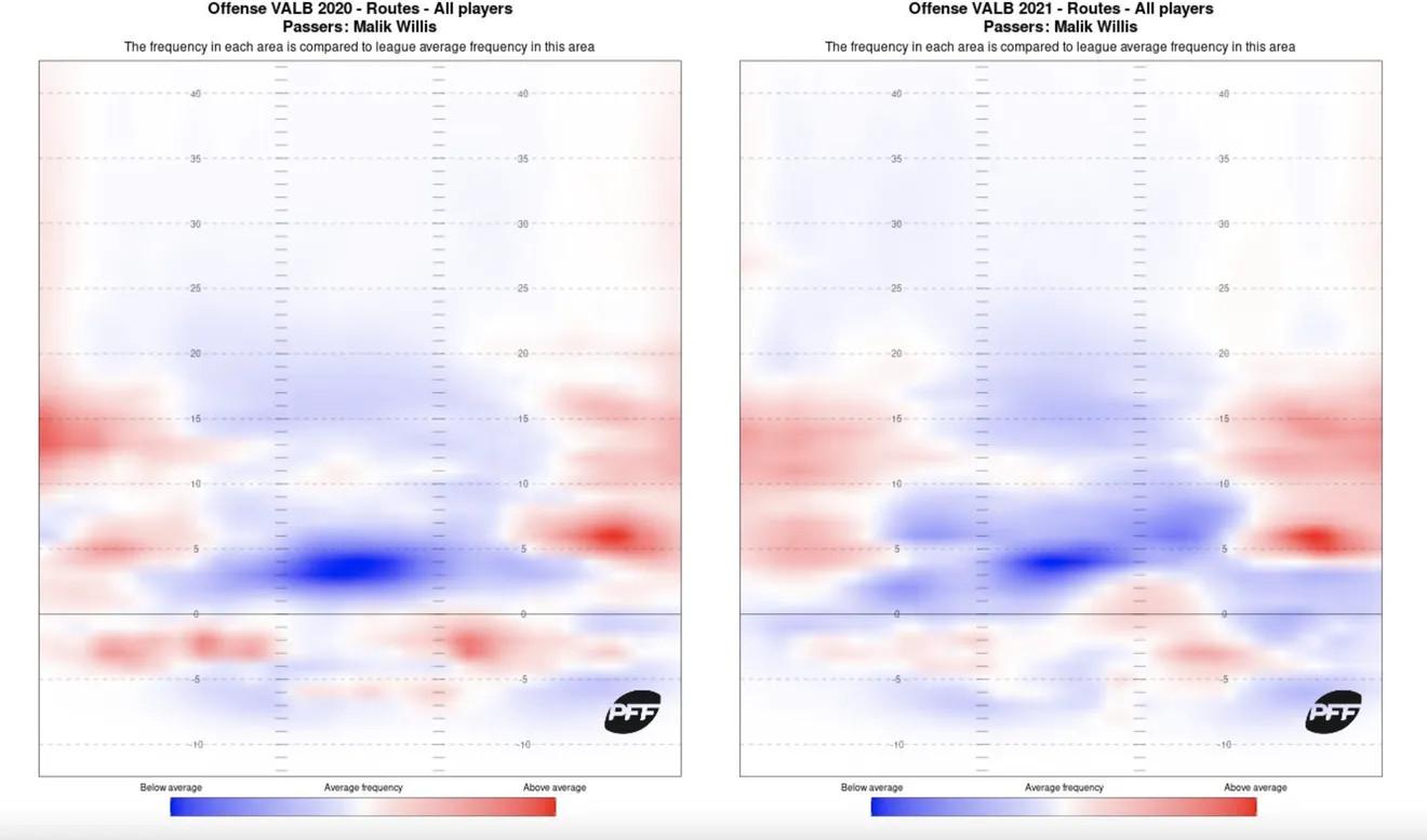 While Tannehill and Willis are quite different as passers, they do both possess rushing ability. Last season, Tannehill scored seven rushing touchdowns (second most among QBs) and logged 32 first downs (fourth) on the ground. But according to PFF, he registered only 11 carries that went 10 yards or more and none of his designed carries went for 15 yards or more; his longest rush of the season was a 28-yard scramble. He also fumbled 10 times. Tannehill’s rushing ability is featured as a clear secondary option to complement Derrick Henry and the Titans rushing attack, mostly effective in short-yardage situations and around the red zone. It stands to reason that Willis’s rushing ability will be built into the Titans offense in virtually any situation on the field, and would add an explosive element that only a few teams boast from under center. Perhaps Tennessee will get Willis’s feet wet by deploying him as a wildcat QB, similar to how the Eagles initially used Jalen Hurts during his rookie season.