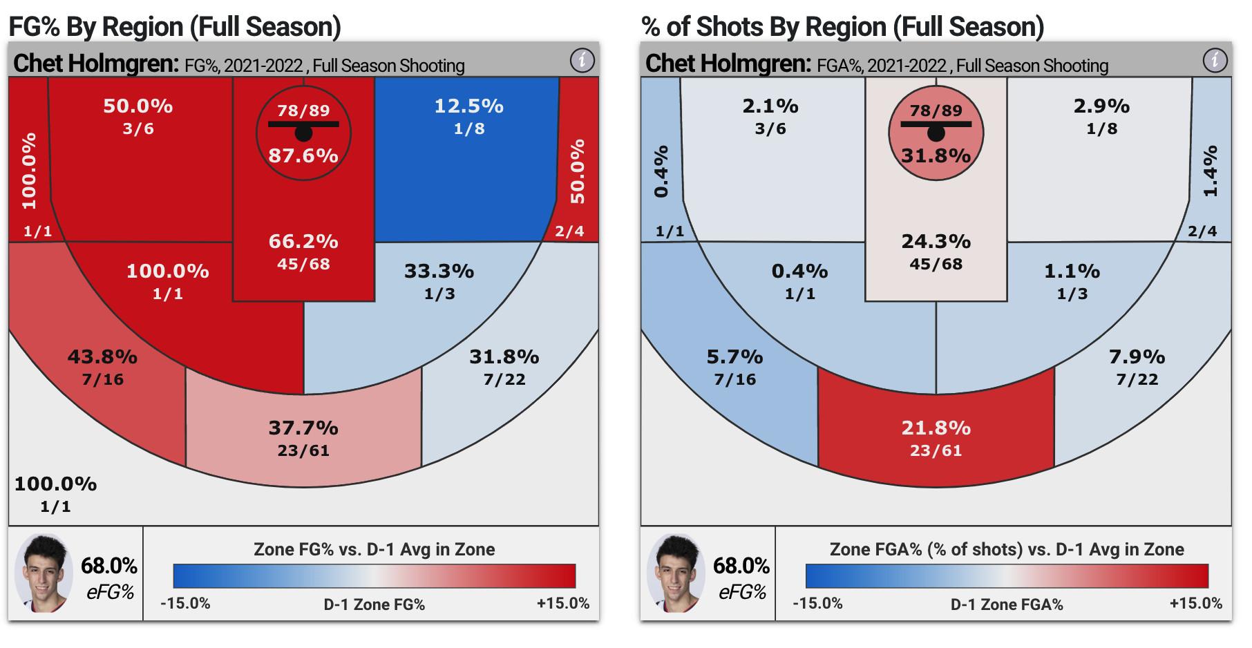 Holmgren managed to shoot 39 percent from 3, despite being somewhat up and down. There were stretches when he was blazing hot. During the middle of the season, from December 18 to February 15, he hit 54.3 percent of 46 3-point attempts, and if that percentage had held from wire-to-wire, I think we’d be talking about one of the most uniquely tremendous two-way college basketball seasons of all time. But he seemed to lose confidence and missed 25 of his final 32 attempts.