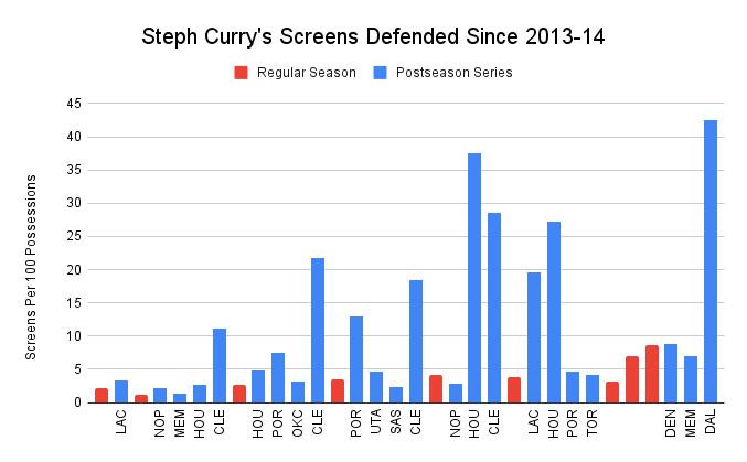 In the regular season, Kevon Looney defended five times as many screens as Curry on a per-possession basis. Green defended nearly three times as many. But against Dallas, Curry has defended nearly twice as many as Looney and Green combined.