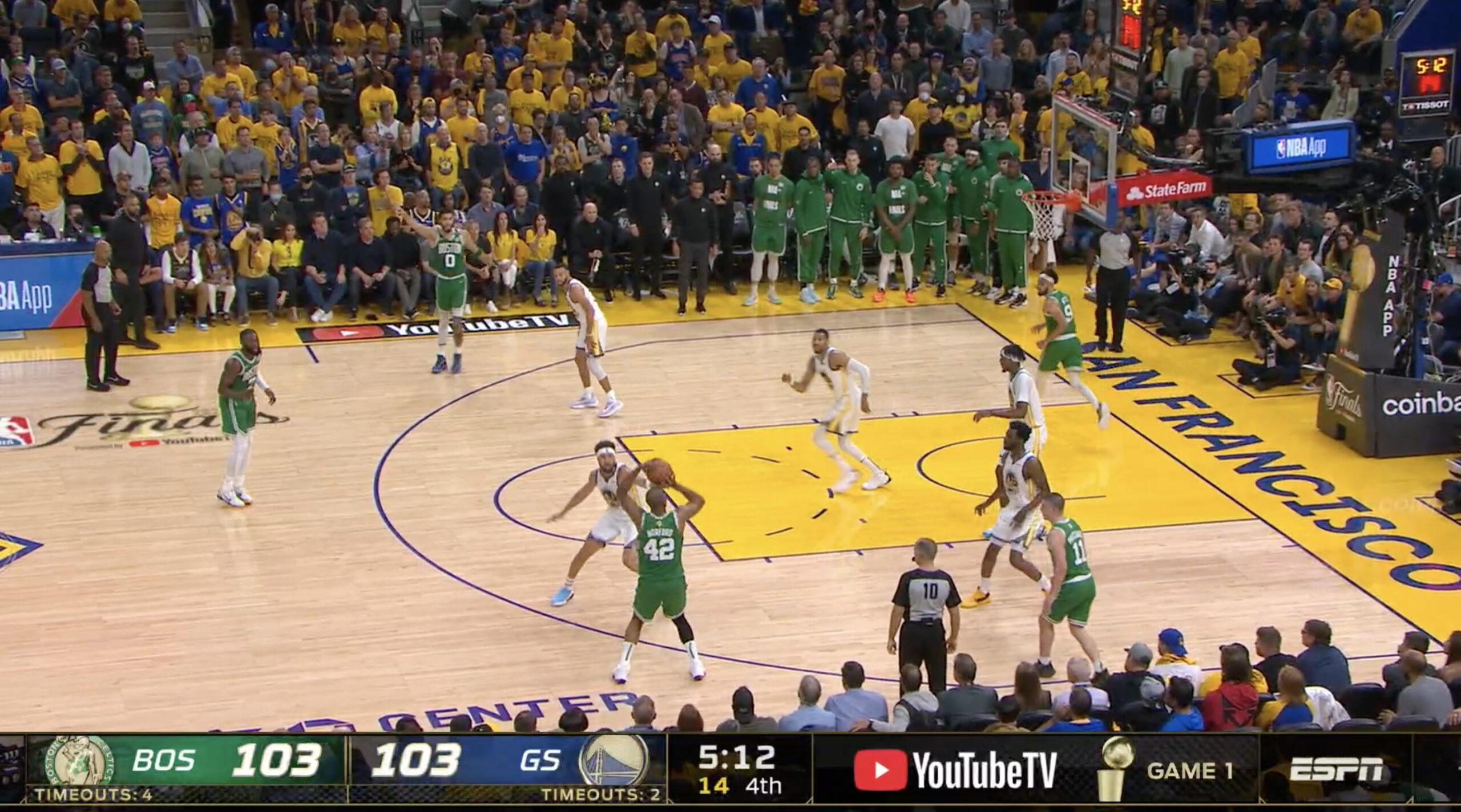 The Celtics would get into even better position midway through the fourth, when Horford (who scored a team-high 26 points and hit six of eight 3-pointers) checked in for Williams to play alongside Brown, White, Tatum (who scored just 12 points on 3-for-17 shooting, but who played a brilliant floor game with 13 assists and two turnovers in 42 minutes), and Pritchard (who played the bulk of the period in place of Smart). Replacing the lob-catching rim-runner with someone who’d drilled 43 percent of his 3-point shots coming into Game 1 meant that Boston could play five-out offense, spacing the floor with five legitimate threats to shoot off the catch.
