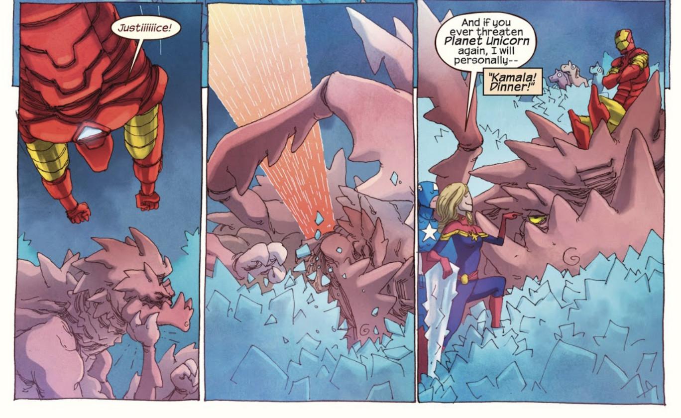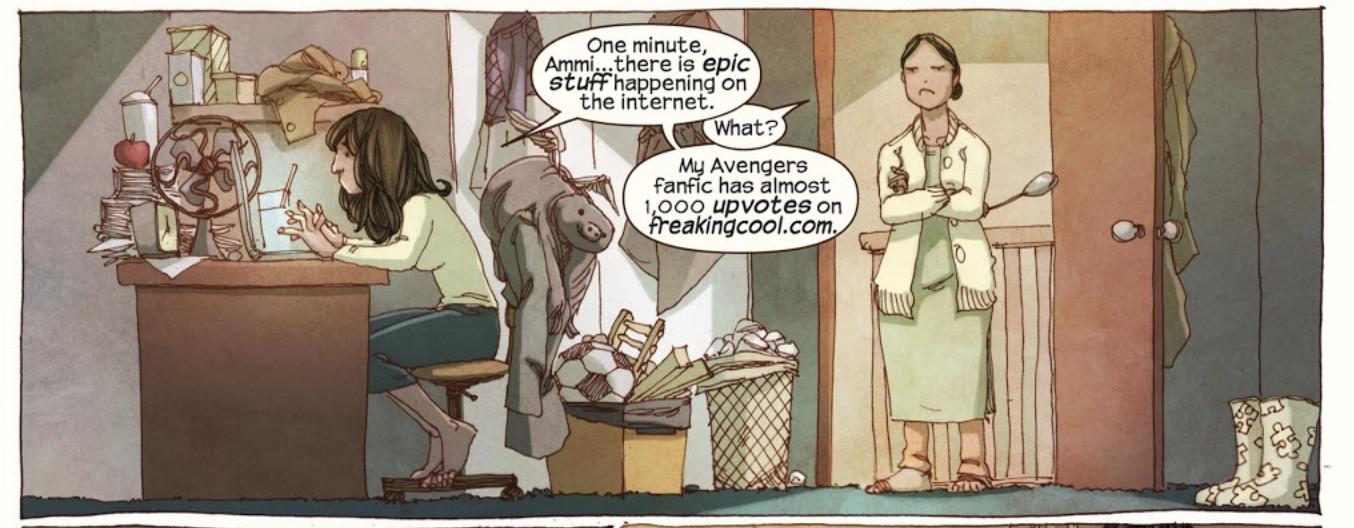 If you’re unfamiliar with Kamala, you may be wondering why she’s borrowed Captain Marvel’s former moniker and a similar costume design. The Ms. Marvel name was once used by Carol Danvers when she got her own title series in the late 1970s, as the Captain Marvel name was already taken by the Kree warrior Mar-Vell. (Marvel really didn’t try too hard in coming up with the names for that one, did they?) Several characters have taken on the mantle of Captain Marvel over the years, including Monica Rambeau, and it actually wasn’t until 2012 that Danvers took on the title herself, paving the way for Kamala to become Ms. Marvel soon after. And the high school student is a character built on Marvel comics lore: Kamala is a massive Avengers fan who wears superhero-inspired clothing to school and spends her Friday nights writing Avengers fan fiction.