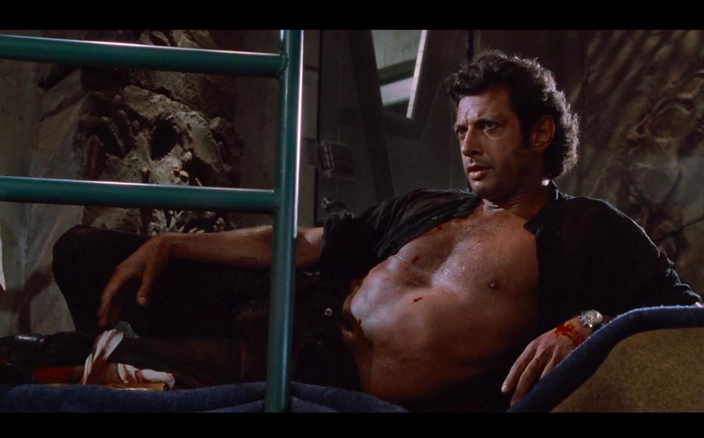 The ensuing shot of Goldblum—bare-chested, blood-spattered, sporting a 5 o’clock shadow—is among the most memorable images in a movie featuring a host of realistic, computer-generated dinosaurs.
