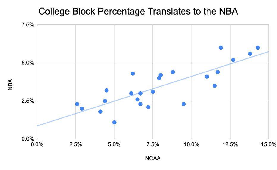 That’s a meaningful indicator for Holmgren’s NBA future: As ESPN’s Kevin Pelton has written, block rate translates from college to the pros better than any other statistic. And in this sample, that relationship mostly holds, too. For instance, on the other end of the list, only five bigs in this sample had a college block rate below 5 percent: Marvin Bagley III, Thomas Robinson, Drew Gooden, Cody Zeller, and Jahlil Okafor. Bigs who can’t protect the rim in college don’t go on to succeed in the NBA.