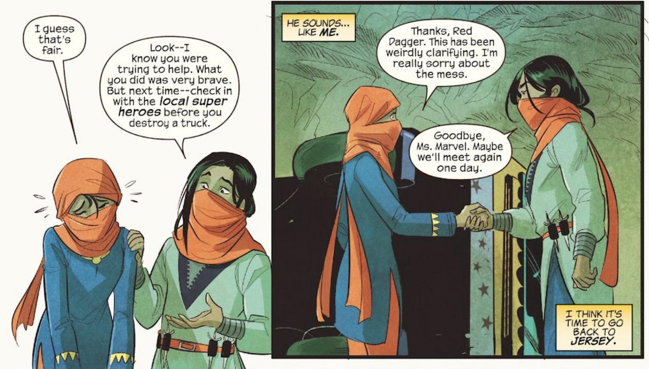 The fourth episode, in particular, develops Muneeba and Sana as three-dimensional characters and makes them easy to empathize with, as we begin to see how their losses and discordant history have trickled down into Muneeba and Kamala’s own relationship, and why Sana had always been dismissed by other members of the family as being a bit kooky. “Seeing Red” also draws inspiration from a Ms. Marvel comic that similarly finds Kamala traveling to Pakistan for a month-long vacation with her relatives and an unexpected team-up with Kareem, the Red Dagger: