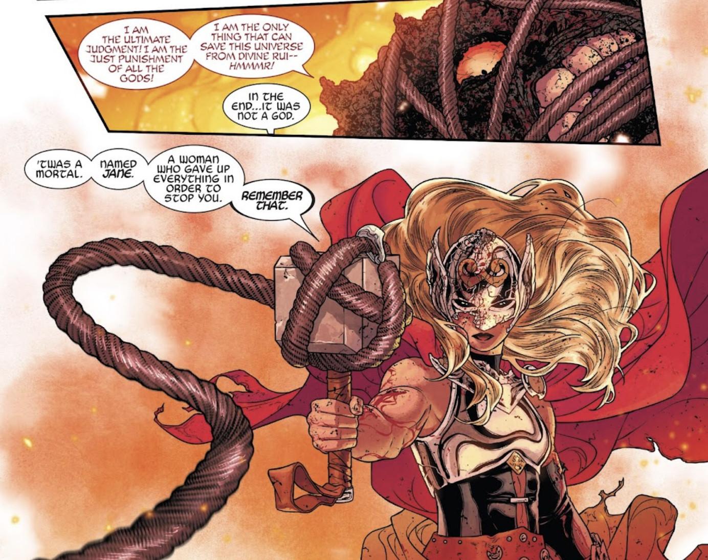 Without getting too into the weeds, there’s a story line in the comics called Original Sin (2014) in which Nick Fury, who has assumed the omniscient abilities of the Watcher (as seen in the animated anthology What If … ?), whispers a phrase to Thor that rattles him to the point that the god no longer believes himself to be worthy. Thor loses the ability to pick up Mjolnir, paving the way for Jane Foster to become the Mighty Thor. As is later revealed in Unworthy Thor, the phrase Fury whispered to Thor was “Gorr was right.”
