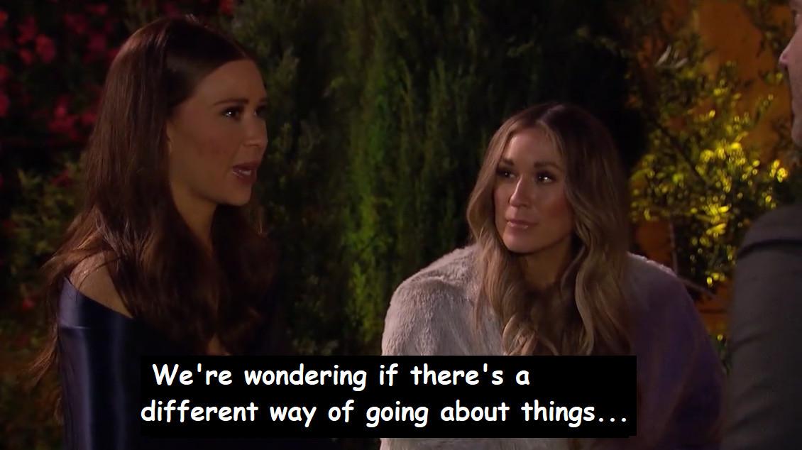 “So, two women dating one group of men—how’s that gonna work?” I’ll tell ya: Probably not well, bitch! “Which woman gets to date which guy? Who chooses? And what happens if both women fall in love with the same man?” All great questions, my guy! “Honestly I’m not really sure.” Exsqueeze me? “But I am confident that Rachel and Gabby can figure it out.” I’m sorry, Rachel the flight instructor and Gabby the ICU nurse are supposed to figure out how to organize what a group of paid Bachelorette professionals apparently could not?! “The most important thing is the women come in with a plan of their own.” That is NOT EVEN A LITTLE BIT TRUE!