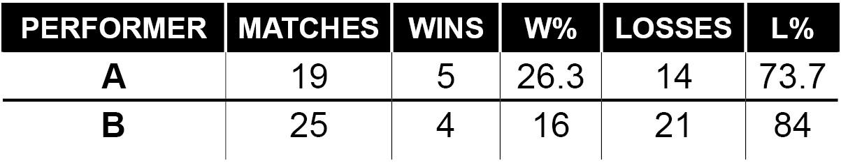 As it is with the Miz, she is almost certainly a Hall of Famer. But unlike Mike, she has had at least a few years of serious contention over the past decade—she won a shocking (at least to us) 82 percent and 76 percent of her matches in 2015 and 2013, respectively. She has also had the bottom fall out over the last three years after a resurgent period between 2018 and 2019, winning less than 25 percent of her matches since then (and in spite of a surprise Women’s Tag Team title reign with Tamina in 2021 that was nearly as long as her other two title reigns combined).