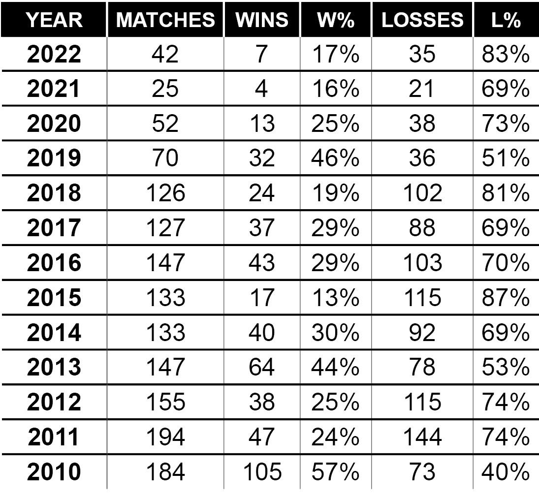 They are representatives of a very specific kind of archetype that does not require a regular diet of wins in order to have a seat at the table. Which is the nicest way I can think to put to you all the fact that this bunch has lost (and continues to lose) a lot—as of 8/8/22, 286 times in 383 matches since 2021 started—but do so with the kind of soaring aplomb that you almost have to admire.