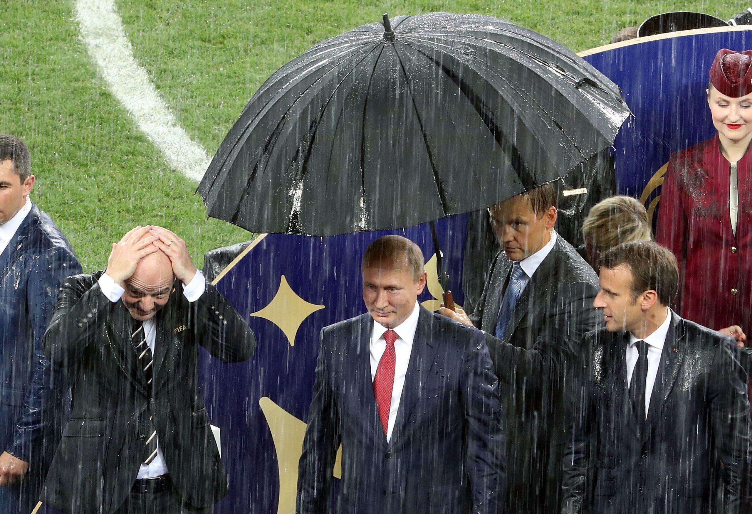 All except one. An anonymous-looking aide is holding an umbrella for Vladimir Putin. He’s the only one in the stadium who stays dry.