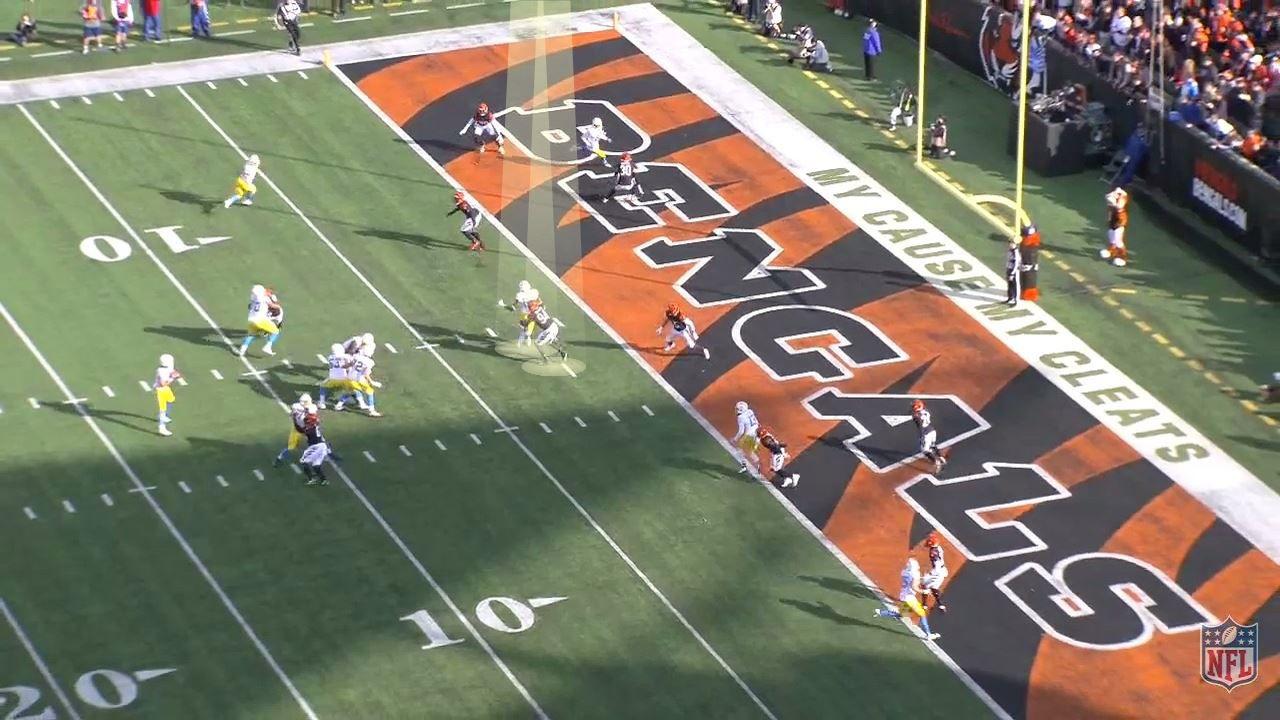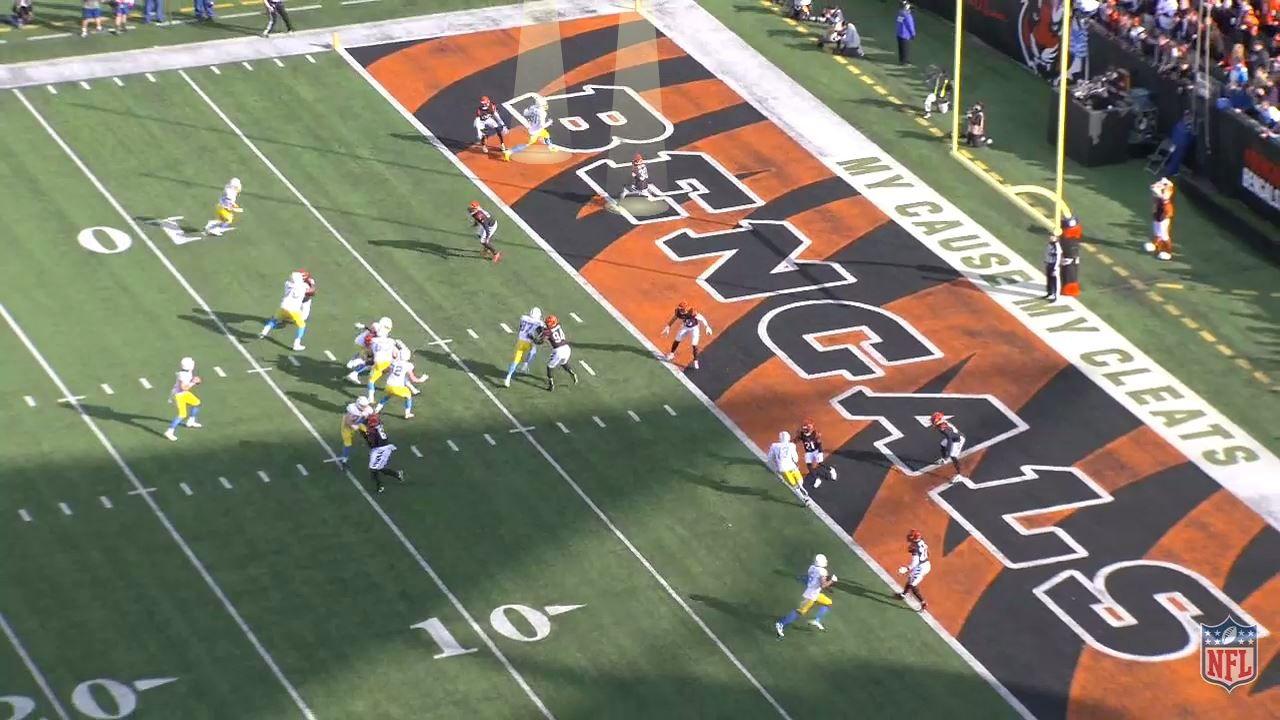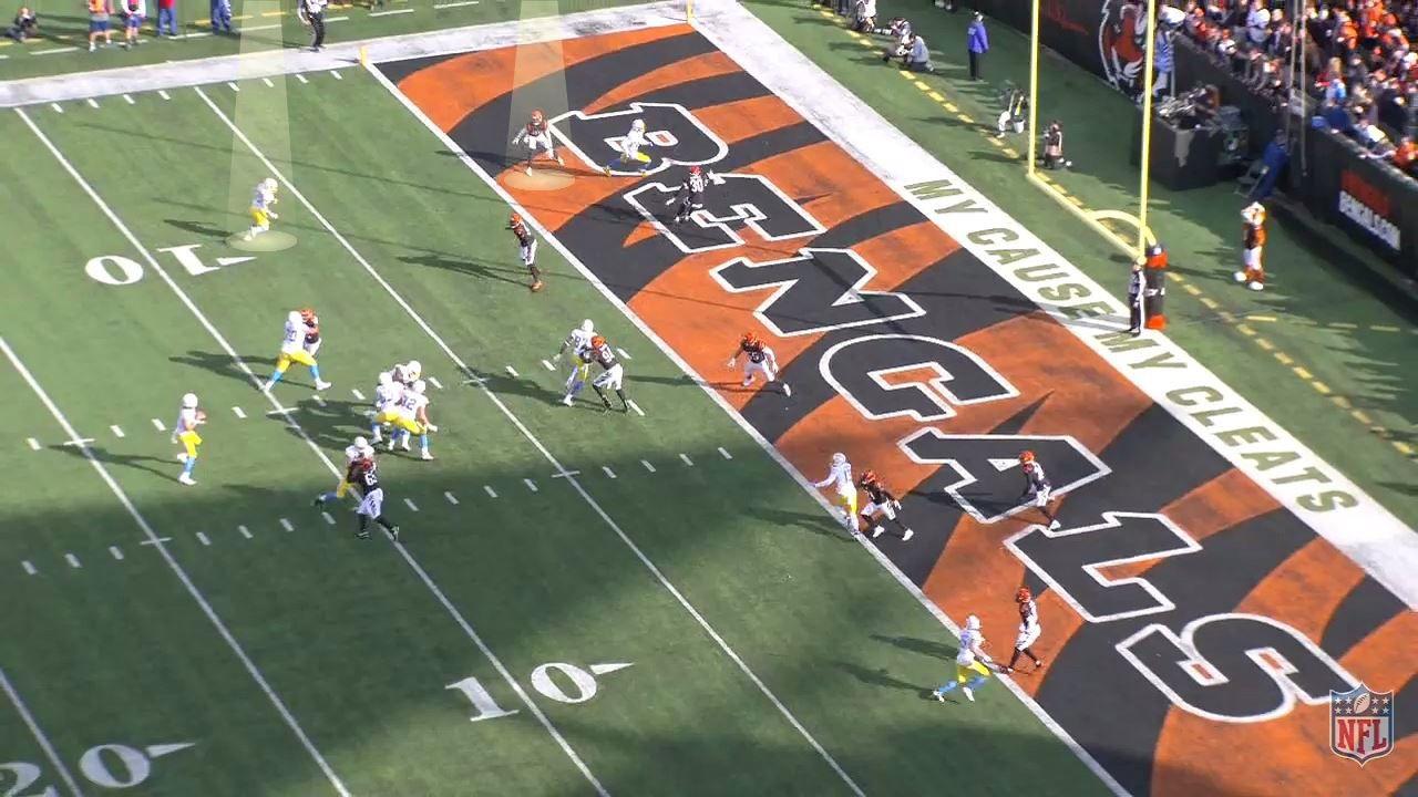 So Herbert’s eyes move on to tight end Jared Cook, who’s running a shallow crossing route from the opposite side of the formation. Cincinnati had that covered, too: Sam Hubbard, who typically rushes the passer, had dropped back from the line of scrimmage.