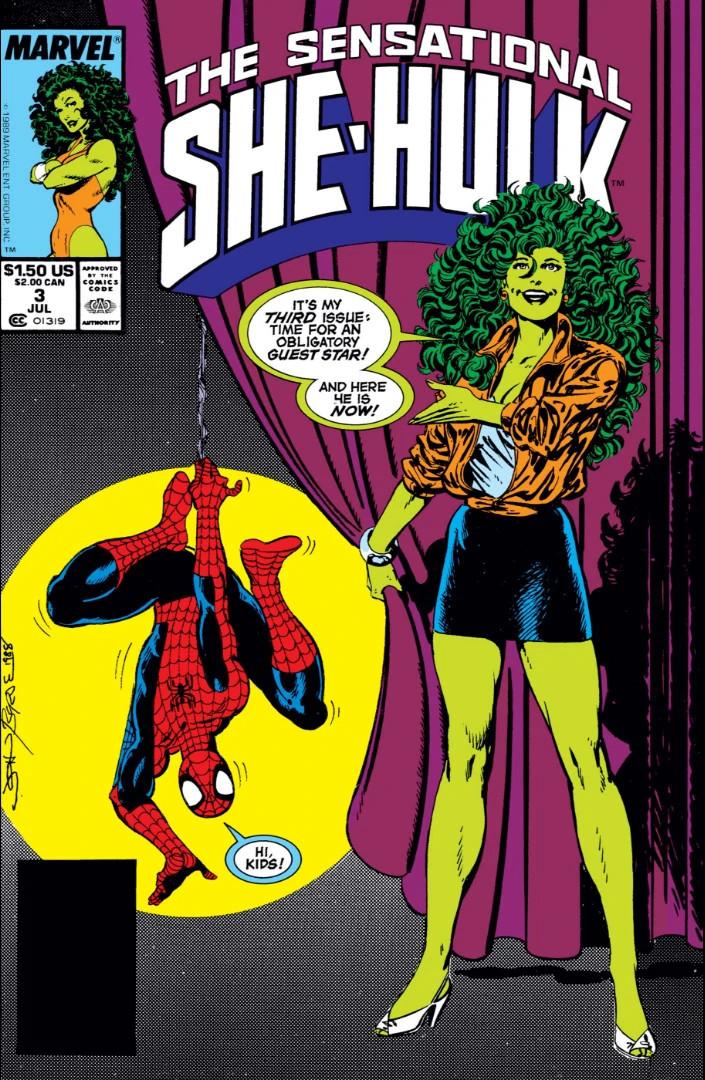 Although almost every MCU TV show has had its fair share of cameos (with the exception of Moon Knight), She-Hulk is setting a record pace for including familiar faces from previous Marvel affairs. That may seem like a deliberate ploy to rope in viewers who might not otherwise want to watch a lesser-known title character, but in many ways, the pattern feels true to She-Hulk’s history in the comics. In John Byrne’s Sensational She-Hulk run from the late 1980s and early 1990s, which head writer Jessica Gao refers to as “essential She-Hulk,” the third issue also happens to feature a prominent guest star—and She-Hulk personally let the readers know on the comic book’s cover.