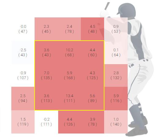 Murakami’s excellence to all fields is mirrored in his excellence against all pitch types. According to DeltaGraphs, Murakami leads qualified NPB hitters in per-pitch production against four-seamers, sliders, splitters, and cutters, while rating well above average against sinkers, curves, and changeups. Nor does he have a weak spot in or around the strike zone. As Sneed says, “I always look for, Does a guy have a hole? Does he struggle with something in, does he struggle with spin in a certain spot? … And I haven’t seen one. … It’s not like he’s just hitting the ball up or he’s just hitting the ball down or whatever, he’s covered everything. … Lefty, righty, a guy that throws soft, a guy that throws hard.” It’s true: Murakami’s heat map (displaying runs above average per 100 pitches) is red virtually everywhere. Mura-god indeed.