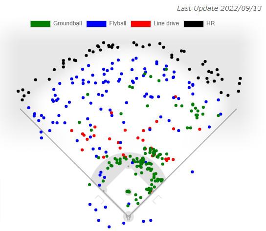 While Oh and Matsui pulled most of their long balls—as do most prolific home run hitters—the left-handed Murakami has launched more than half of his homers to left or center. The oppo shot he hit for his 55th is indicative of his huge power to all fields, as shown in this spray chart from DeltaGraphs.