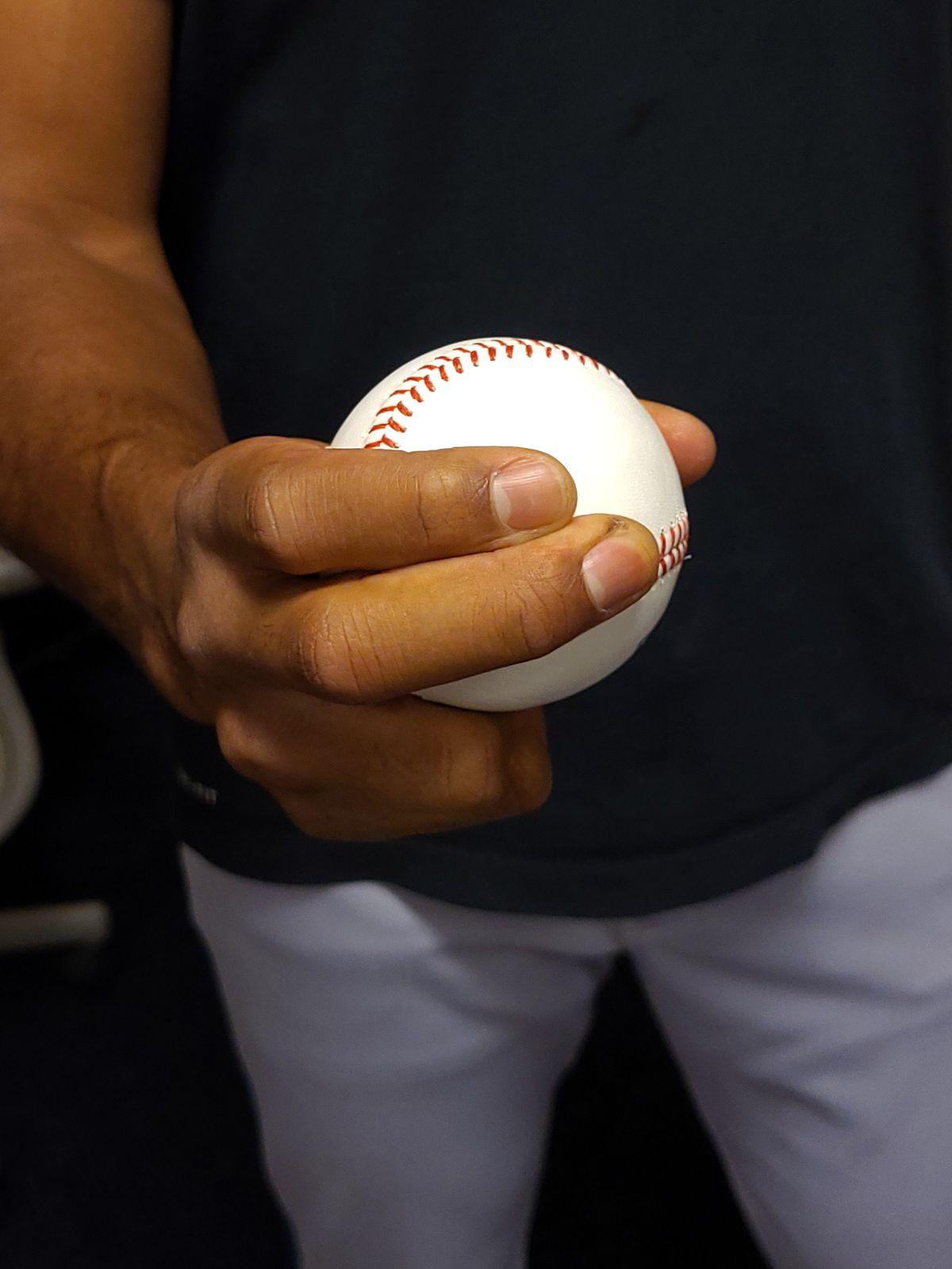 Well, almost every weapon. Here’s where we acknowledge that Alcantara keeps a fifth pitch in his back pocket: a curveball that he used to throw semi-regularly. “It’s really not a bad pitch,” Stallings says, but it is Alcantara’s worst one. He’s thrown it only 11 times this season—so few that one could count them on Antonio Alfonseca’s fingers. The last one was a hanger that Mike Moustakas almost hit for a homer on August 3. After that, Stallings says, “We were kind of like, ‘Huh, well, maybe we should stick with what we know.’” There’s no room for a fifth face on Mount Rushmore or a fifth pitch in Alcantara’s rotation, though he hasn’t forgotten how to hold it. “And the pitch that I never throw,” he says, mid-modeling session, laughing and flashing the grip.