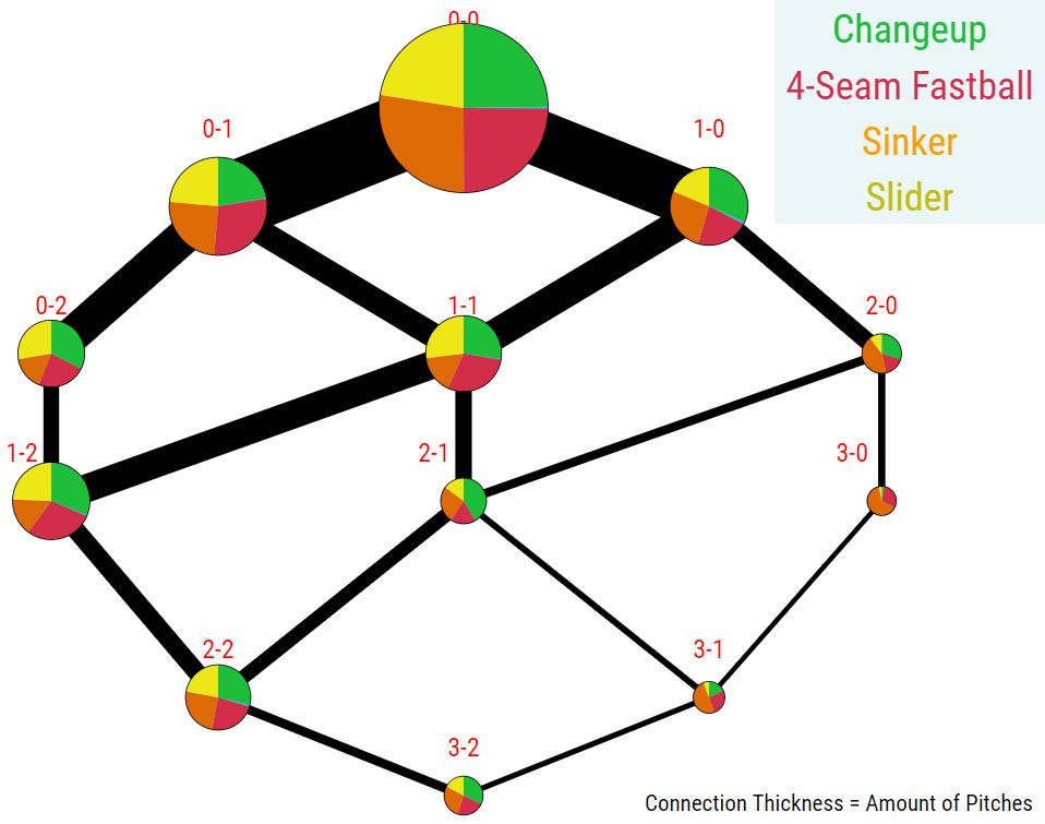 The plot and table below show how hard to predict Alcantara’s pitch mix makes him. His overall usage rates are roughly the same in the most common counts, and while the right-hander varies his pitch palette somewhat by batter handedness—throwing pitches with smaller platoon splits (four-seamers and changeups) to lefties and those with larger platoon splits (sinkers and sliders) to righties—he rarely lets the count dictate his approach. Consequently, the hitters who face him can’t let the count dictate their approaches, either; Alcantara makes it almost impossible to sit on a particular pitch, which puts opponents in protect mode and helps him induce ill-advised swings while preventing the most damaging kind of contact. (Per Statcast, Alcantara rates in the 93rd and 81st percentiles in chase rate and Barrel rate, respectively.)