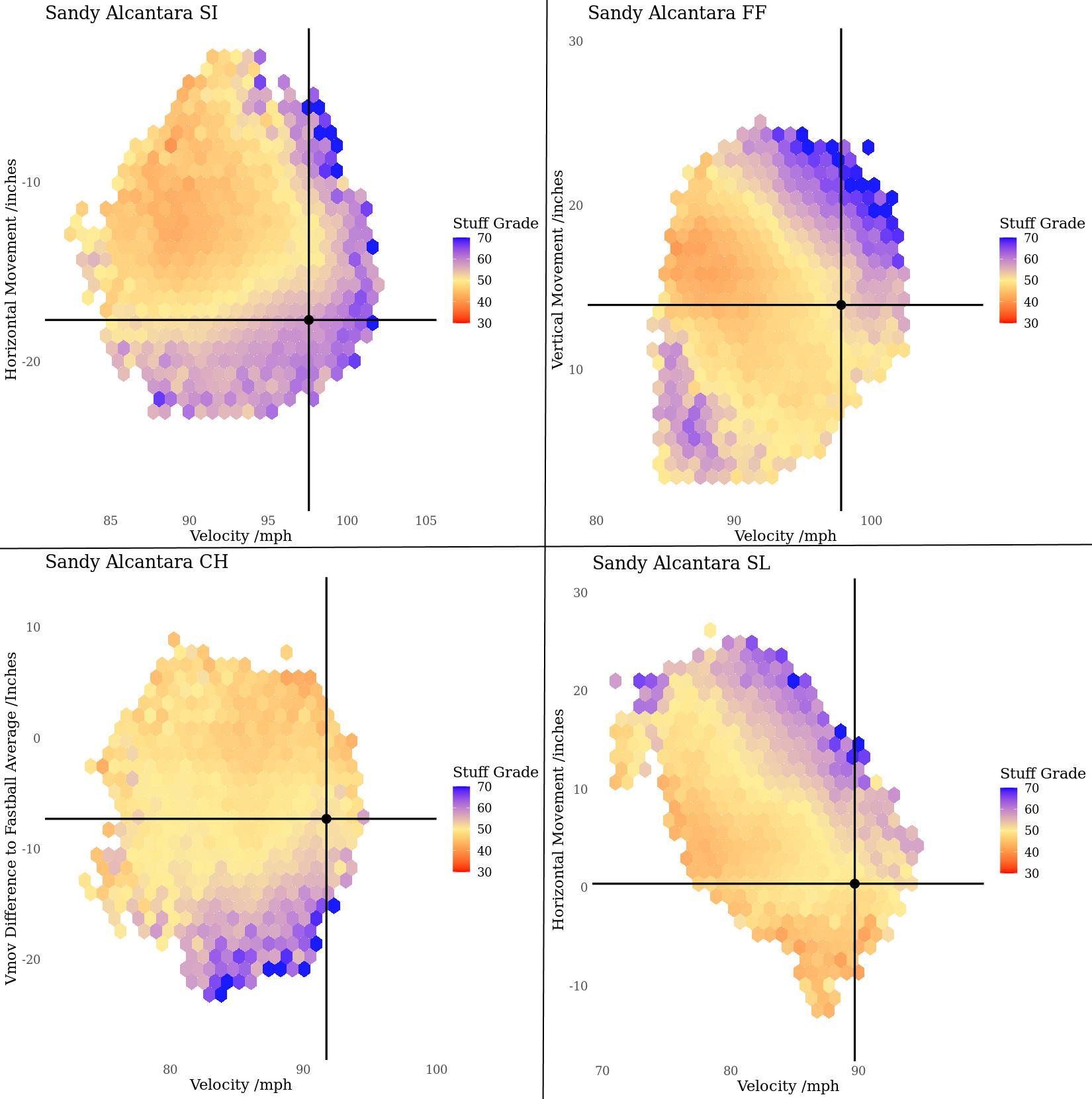 Alcantara’s sinker, which he calls a two-seamer, comes the closest to an elite “stuff” grade, by virtue of its plus speed and horizontal movement. Each of the other pitches exhibits some component that the model dings: The four-seamer doesn’t get great rise, the slider isn’t sweepy, and the changeup isn’t well separated from his fastball in terms of speed or movement. Although he’s 6-foot-5, his extension is subpar, so his “perceived” velocity is a tick lower than his real release speed, and as a right-hander who has a conventional arm slot, he doesn’t derive any advantage from unfamiliarity, unlike a lefty or someone who throws from an atypical angle.