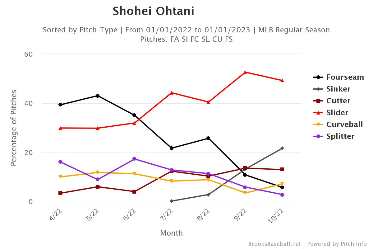Ohtani’s pitching picked up over the course of last season, as the rust from his lengthy, injury-related layoff wore off. But he reached a new level this year, for a few reasons. For one thing, he threw far harder, on average, than he did last year—less because his max speeds increased than because he embraced more of a max-effort (or at least moderate-effort) approach, in which he was more likely to throw toward the top of his speed range regularly, rather than hold his highest velo in reserve for big moments. For another, he’s continued to overhaul his repertoire and pitch usage on the fly, in an almost shockingly drastic and successful manner. Look at how his pitch mix evolved from month to month this season: