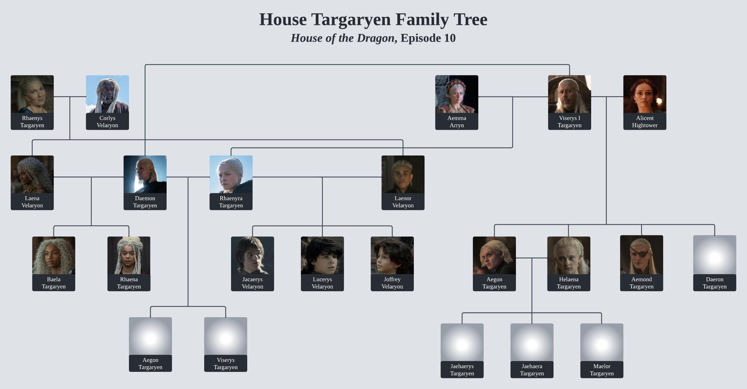 I missed this last week, but the opening credits now have three streams of blood flowing from the union between Aegon II and Helaena, seemingly confirming that their third child, Maelor, will appear on the show. So I’ve added him to the family tree: