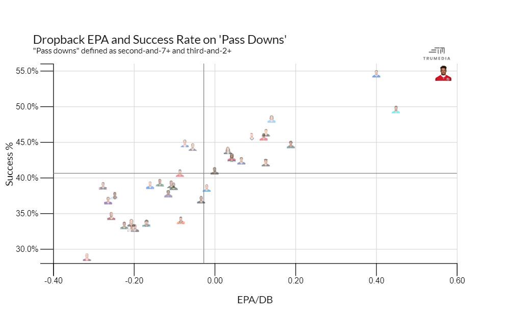 This season, Mahomes has taken another step. Without Hill taking the top off defenses, the Chiefs have had to spread their passing game out horizontally. We’re seeing receivers run more challenging routes on the backside of concepts, and Mahomes is hitting them with regularity. He’s had to be more methodical, as evidenced by a career-low sack rate, while facing the highest rate of pressure of his career. It hasn’t mattered! The Chiefs offense leads the NFL in EPA per play. Mahomes ranks second among quarterbacks in that same stat, third in success rate, and fourth in yards per dropback, according to TruMedia. But where he really separates himself from the rest of the pack is in obvious passing situations—when playing quarterback is most challenging.
