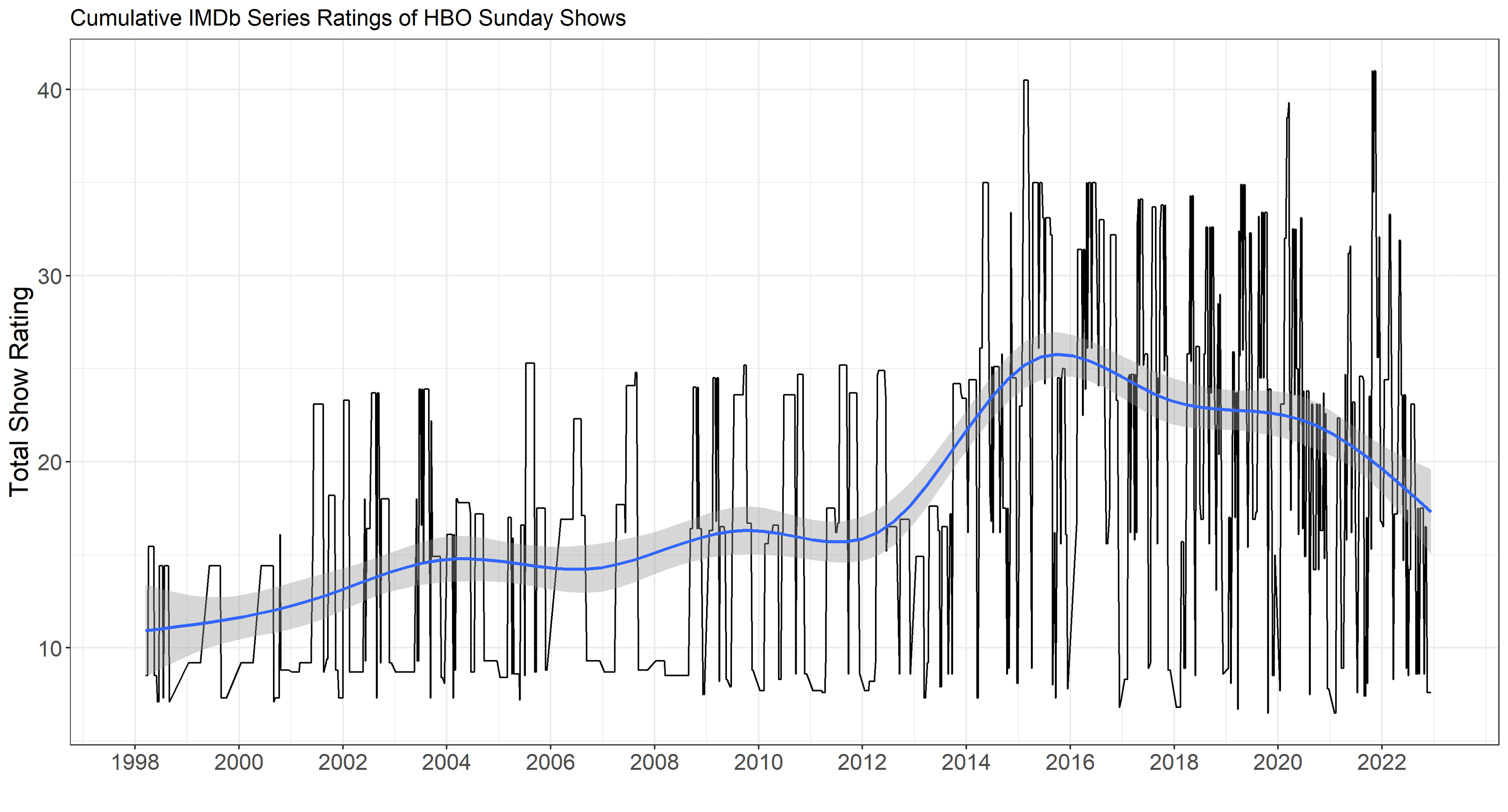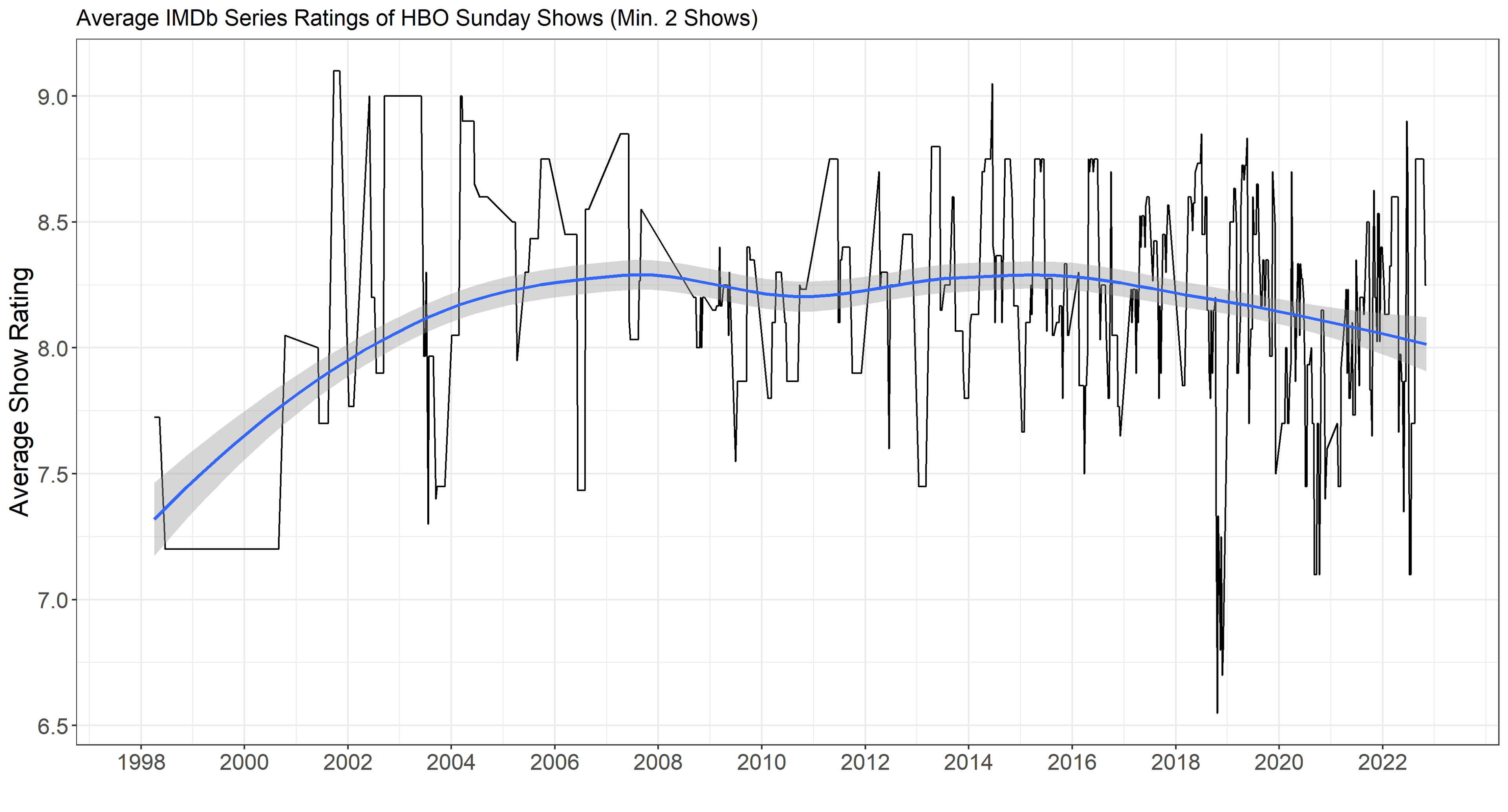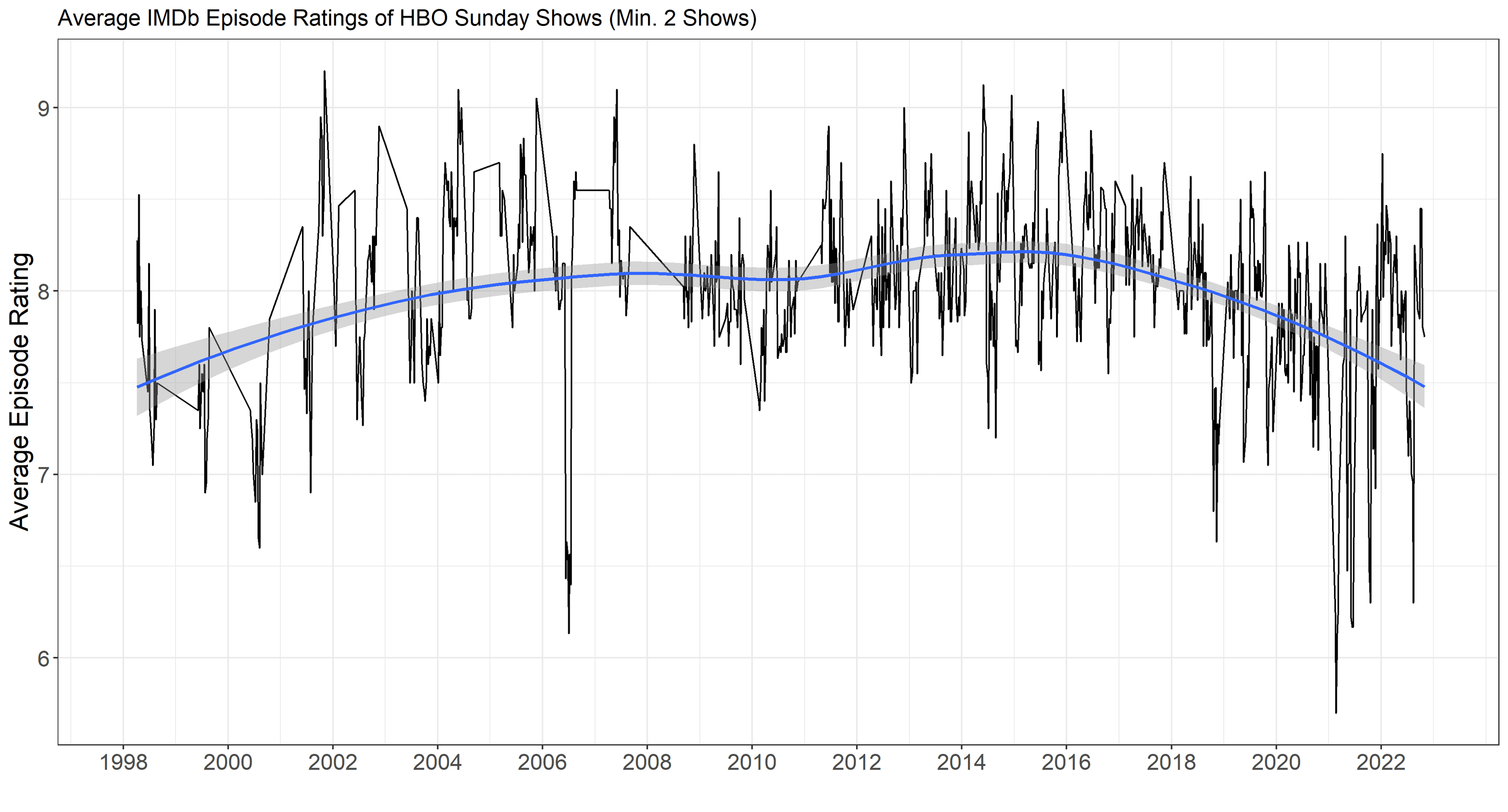 Naturally, HBO’s most exquisite Sunday is a matter of personal taste; your Sunday preferences depend on your series preferences. But we can get a feel for the consensus based on aggregations of many people’s personal tastes: IMDb user ratings. Using IMDb ratings of original, HBO-produced series that aired on Sundays in the United States, we can track the evolution of the lineups over time and measure the caliber of each Sunday’s offerings in various ways: at the series or the individual-episode levels, and based on average or cumulative quality. If Sunday is HBO, then this assessment of Sundays will give us a method of determining when HBO was at its best.