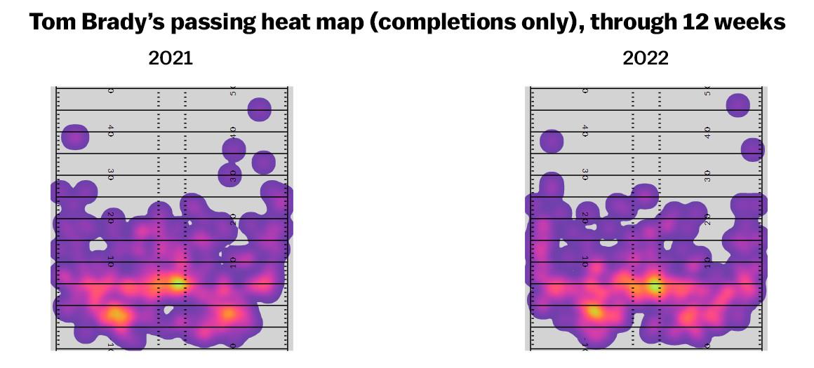 An inefficient run game is hardly a death sentence in today’s NFL, but the inability to run against even the worst defenses does feel like a direct indictment of the interior offensive line and offensive coordinator Byron Leftwich. And it appears that even Brady is unable to overcome those two weak links. Leftwich hasn’t successfully schemed around Tampa Bay’s offensive line issues, instead insisting on calling games as if there isn’t a problem. The Bucs’ system hasn’t changed much from the past two years, when the ground game would set up play-action throws aimed at the middle of the field. But this year, Tampa Bay is seeing a different front as a result of its punchless run game—and that’s making things harder on Brady. You can see the difference in his 2021 and 2022 completion maps through 12 weeks, via TruMedia: