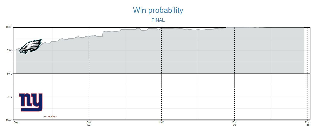 It was an ugly 48-22 loss for the Giants. But New York’s playoff odds dropped only a few percentage points, from 51 percent to 45, and with a win over Washington next week, they would jump to 86 percent, according to FiveThirtyEight. The Giants are still holding on to a playoff spot thanks to Seattle’s loss on Sunday. But the next time New York takes the field, it will have been over a month since it has won a football game. And if not for a garbage-time touchdown against the Eagles backups, Sunday’s game would have been the fourth in a row in which the Giants failed to score more than 20 points.