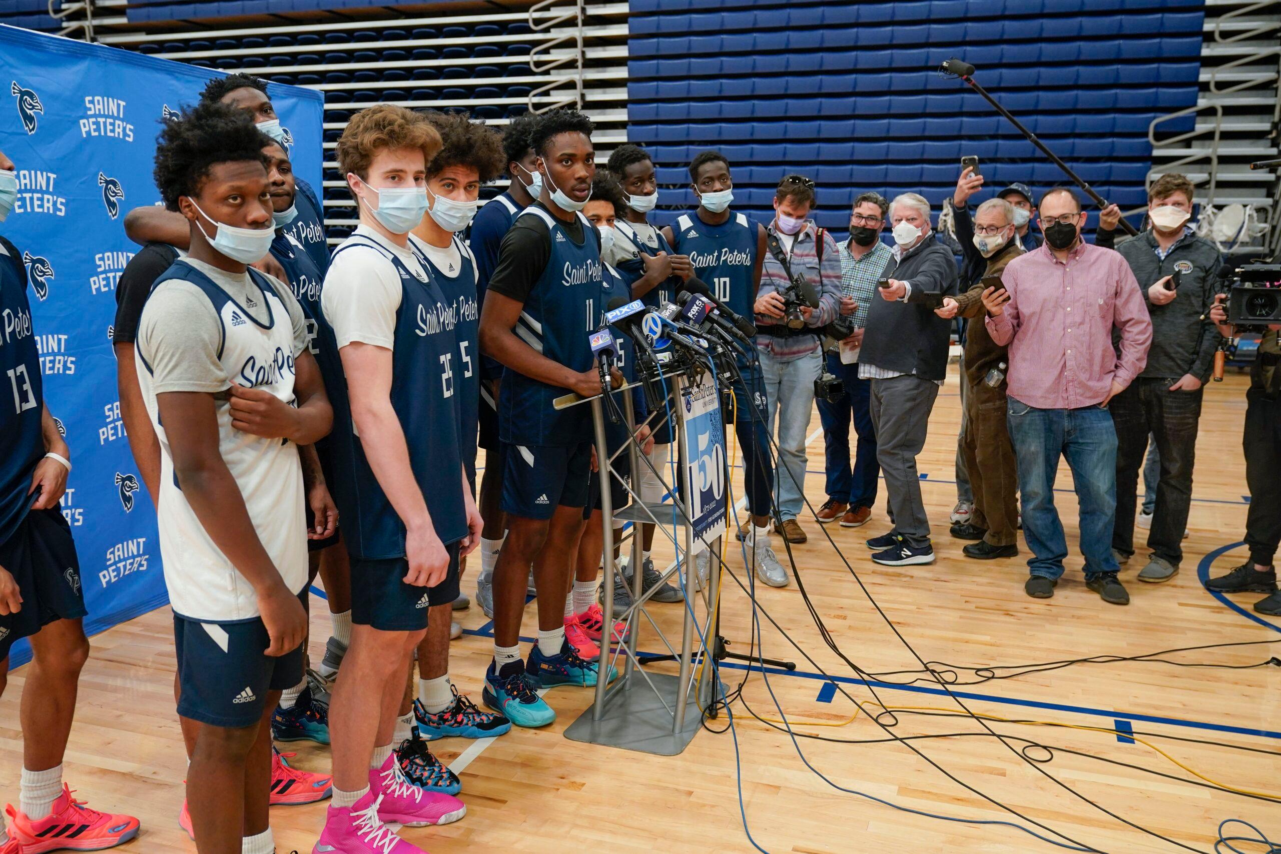 Saint Peter’s gathers for a press conference Tuesday, attended by our own Rodger Sherman (far right).