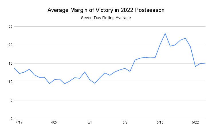Well, sure—as long as you ignore that games 2 through 4 of Warriors-Thunder were all decided by at least 24 points, and that games 1 through 6 of the Finals all finished with double-digit margins. Until Game 7, the average margin of victory in those Finals was 19.7 points—even more lopsided than the recent stretch of blowouts this spring.