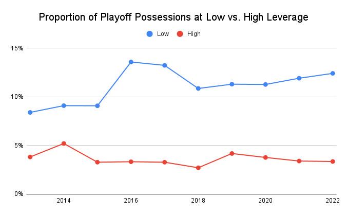 For all the frustration over the lack of close games, though, it’s possible the difference between this postseason and prior playoffs has been overblown. Across the 2021-22 postseason so far, 12.4 percent of possessions have been low leverage, while 3.3 percent have been high leverage, according to analysis of PBP Stats data. (Technically, PBP splits the latter category into “high” and “very high,” but we’re combining them here for ease of use.) Neither figure is far off from the typical NBA postseason. Over the past decade, on average, 11.1 percent of possessions have been low leverage, versus 3.6 percent high.