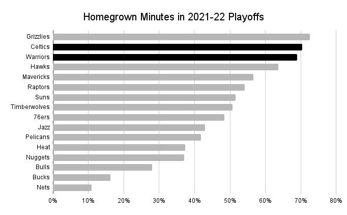 Throughout these playoffs so far, 70 percent of the Celtics’ minutes have gone to homegrown players, and the Warriors check in right behind them at 69 percent. Only the Grizzlies (73 percent) had a higher percentage of homegrown minutes this postseason than either of the finalists; the average across all 16 teams was only 47 percent.