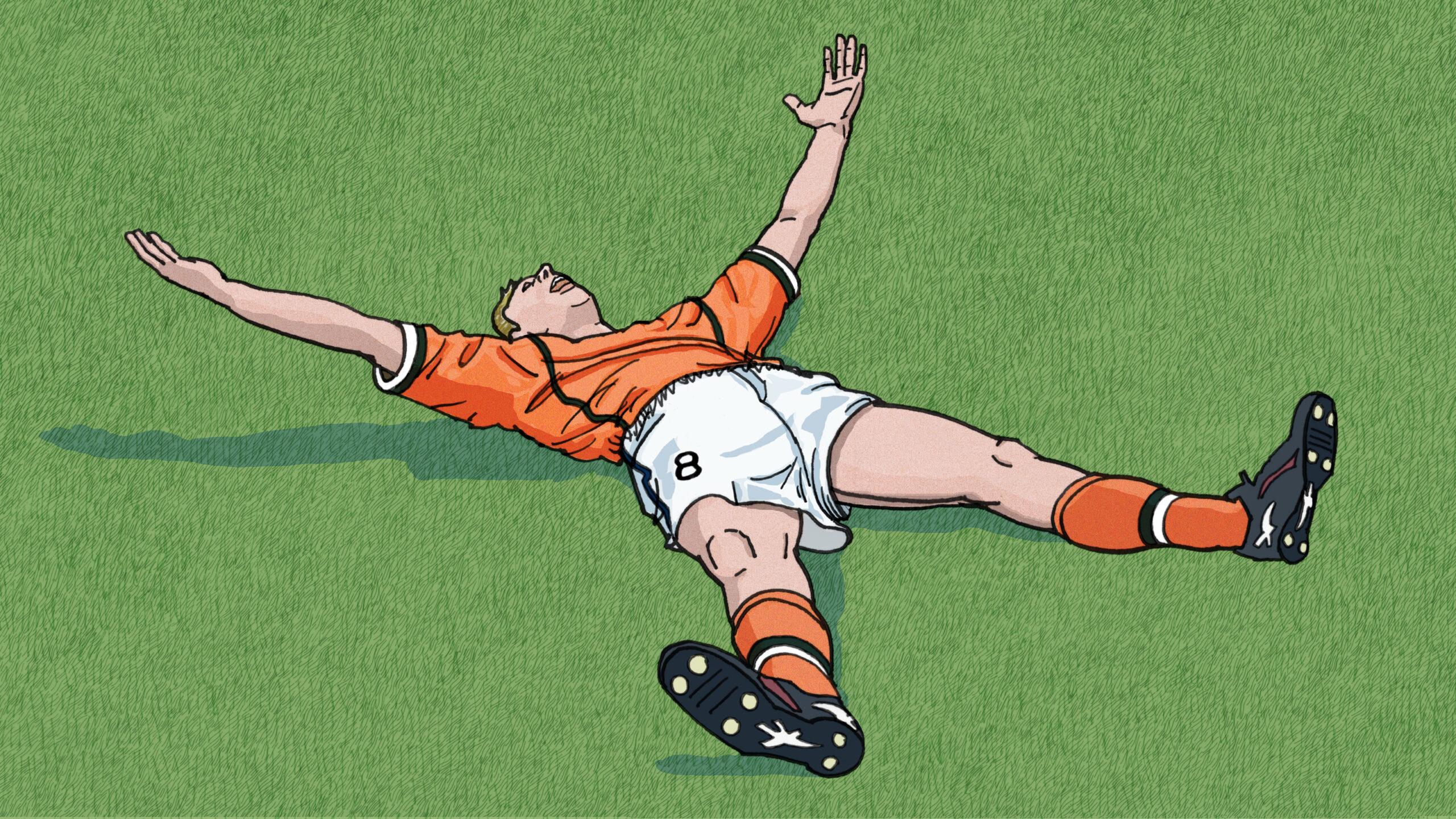 That Dutch commentator definitely said “smork.” Dennis falls to the ground with his arms outstretched. Holland moves on to the semifinals. They lose to Brazil on penalties. Dennis makes his.