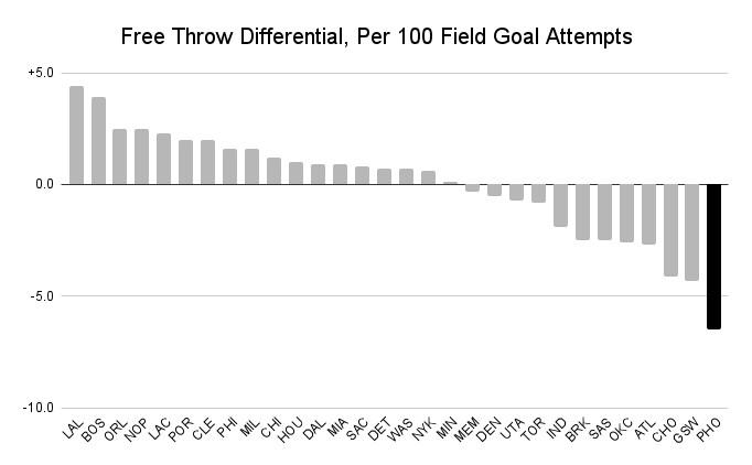 Phoenix ranks 29th in offensive free throw rate and 30th on defense, per CtG, which works out to a net difference of minus-6.7 free throws per 100 shot attempts, by far the worst in the league. Last season, by comparison, the Suns were only minus-1.7 free throws per 100 shot attempts.