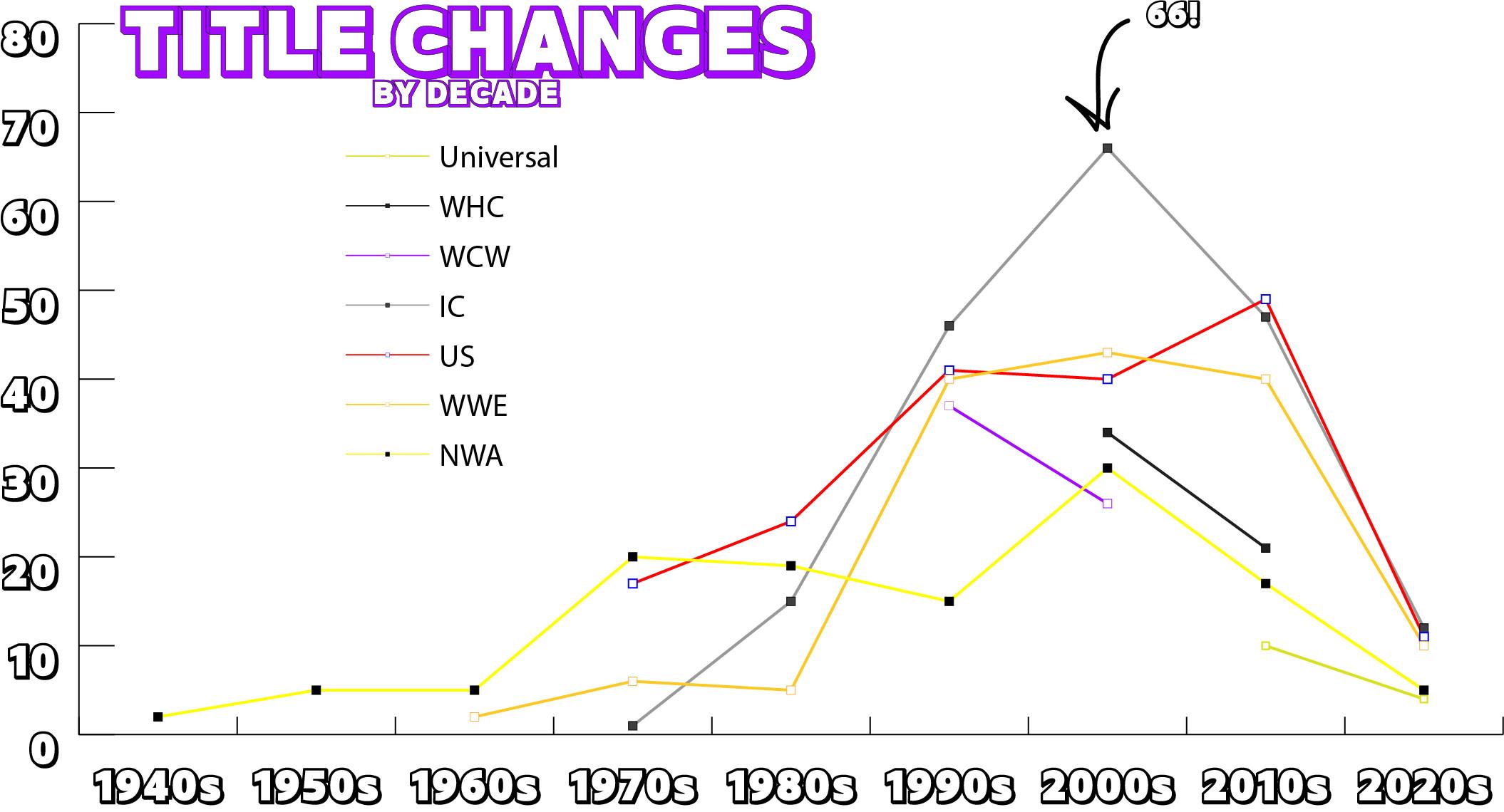 The most extreme example of this is, of course, the WCW championship. While the WCW’s 26 title changes was technically the lowest of those in the 2000s that we looked at, 20 of them happened in, essentially, one year and literally destroyed the company. The last six swaps before the title went defunct were under the auspices of WWE, and the lineage of the belt, like the company whence it came, became the stuff of Rise and Fall DVDs.