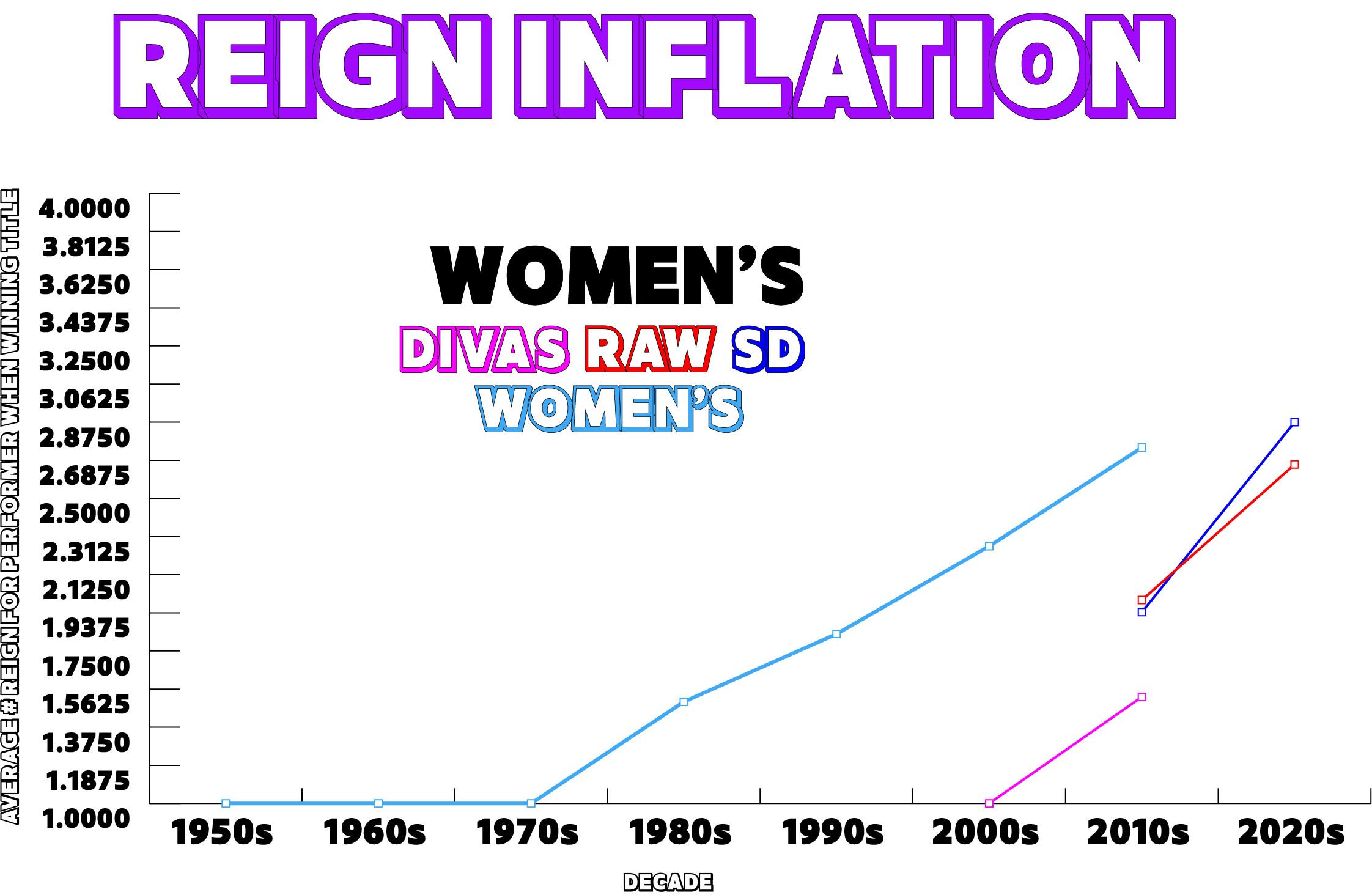 We were able to extract the “rate of reign inflation,” which is, more or less, exactly what it sounds like, out of mountains of championship data. It measures, over a period of time (decades, for our purposes at the moment), the average reign of a championship winner at the time they’ve won the championship. The more times former champions regain a given title in a given time frame, the higher their “inflation rate.”