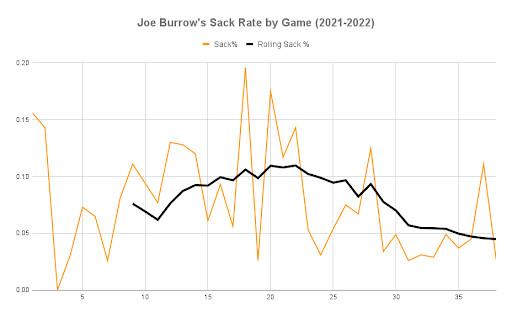 Here’s Burrow’s sack rate by game in each of the last two seasons, with a rolling average of the last 10 games charted along with it.