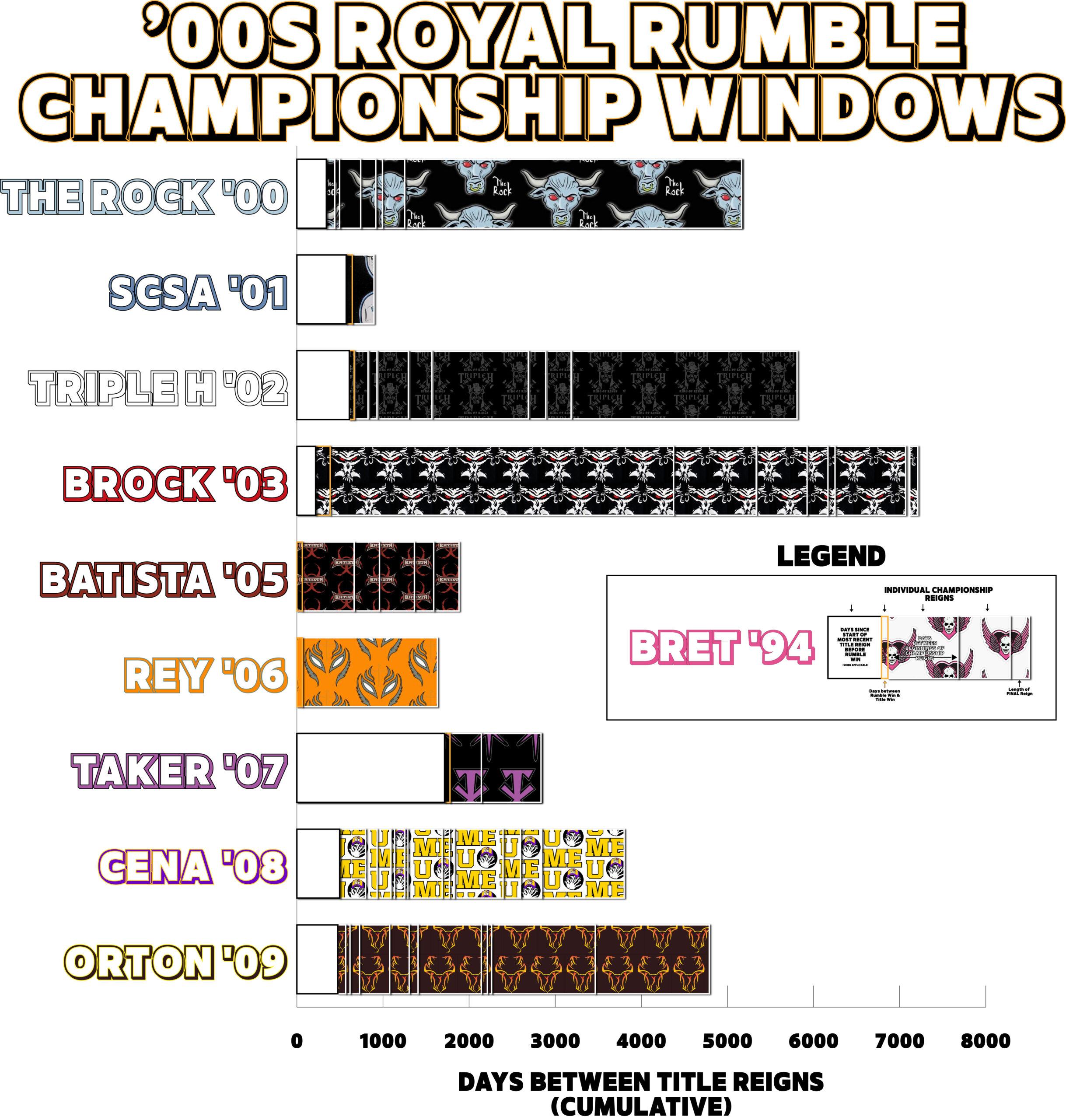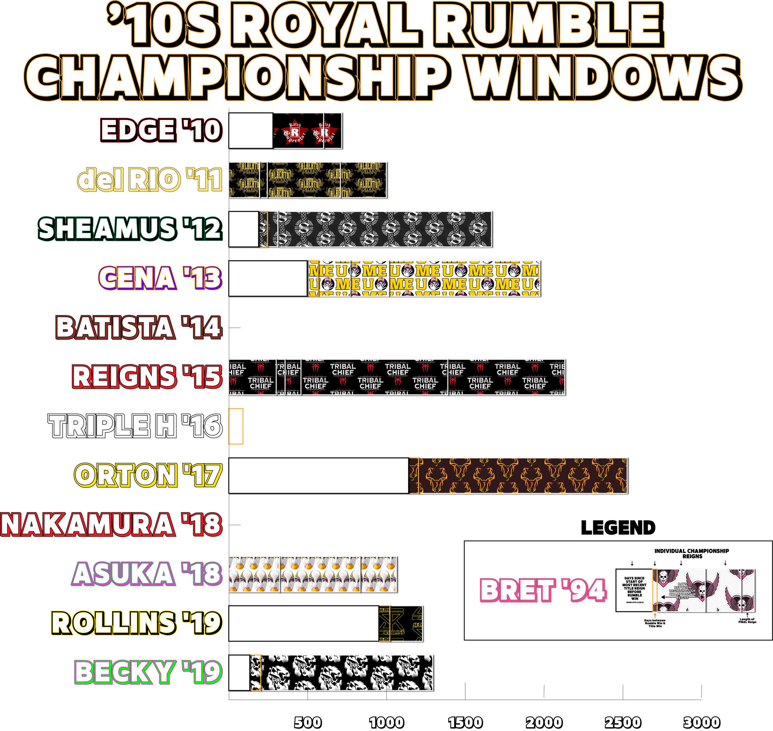 (And, yes, before anyone asks, we did omit the ’04 Rumble winner from our chart. But for those desperately wondering what their championship window was, they were a replacement-level champion with the smallest championship window of anyone we tracked who ended up winning a championship.)