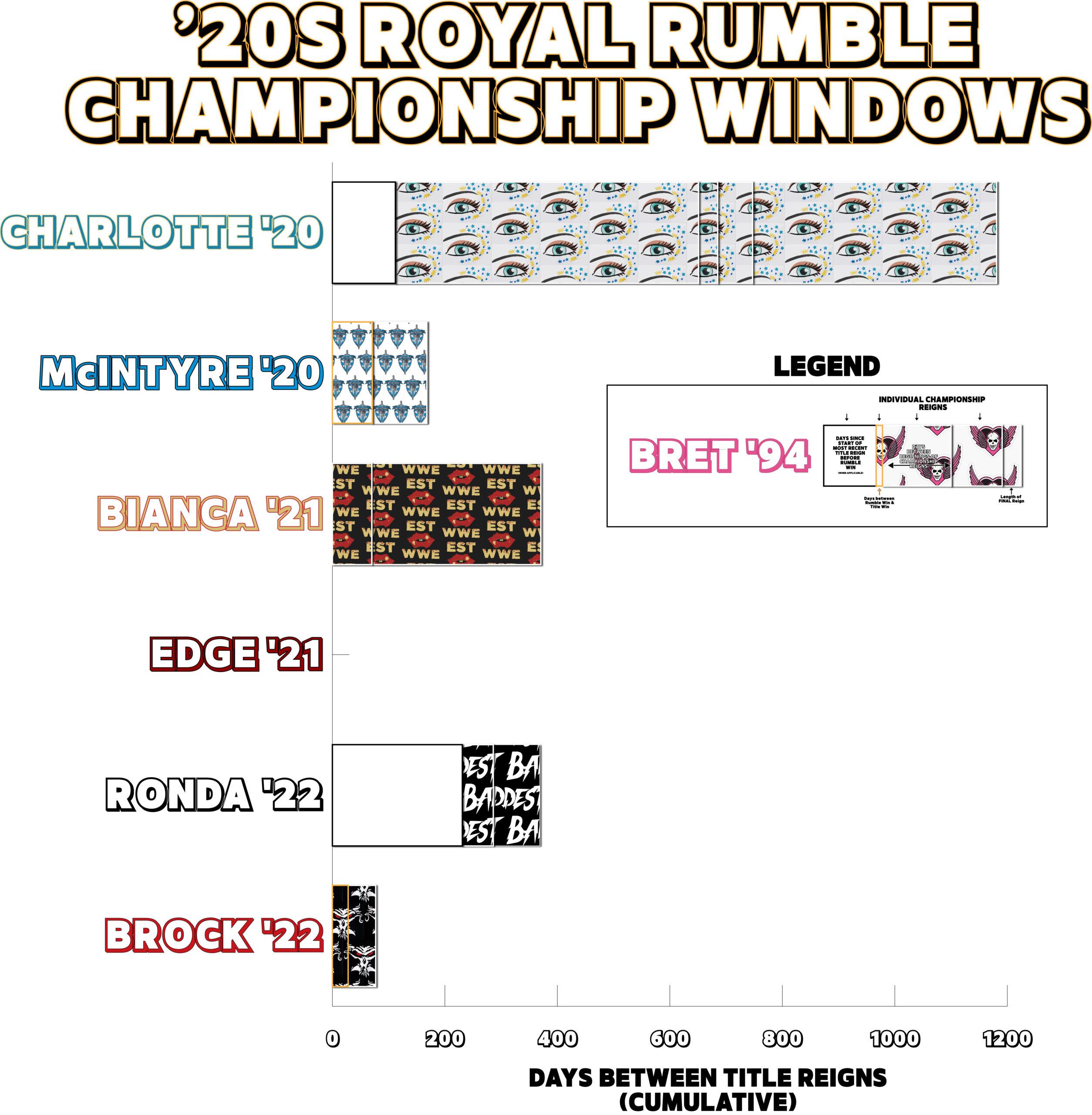 As an idea, and unlike in unscripted athletics, a professional wrestling championship window is how long a company sees a performer as a high-level (if not always highest-level) attraction around whom it can build shows and top-of-the-card story lines. As a statistic, a championship window is literally the time (measured in days) during which a performer is a viable candidate to be made world champion by the company, which is based on, oddly enough, the number of days between the very first day of their very first world championship (or in our case, Rumble) win and the very last day of their very last world championship reign.