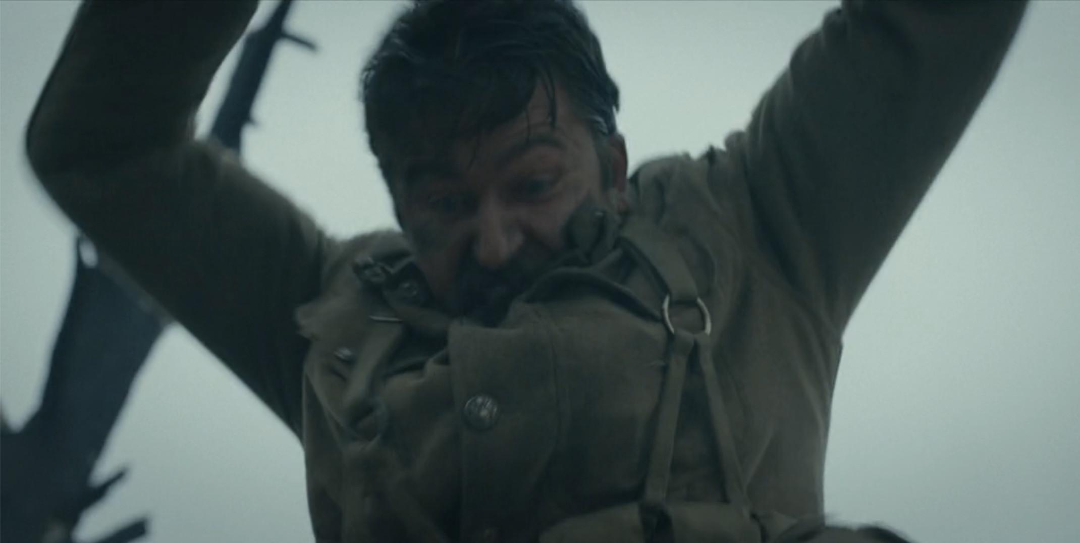In a flashback, we see Spencer at war; when the enemy gets too close, he gets creative with his steel helmet. This will not be the last death via face-smashing.