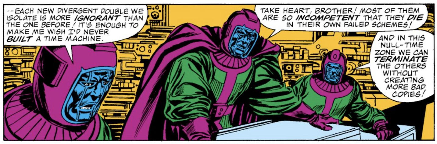 Since then, Kang has reinvented himself many times over; he has appeared as the main villain in a number of popular Marvel story lines, all of which involve the concept of time travel or the existence of alternate realities in some way. Kang’s manipulations of time contribute to his life becoming nonlinear, with all of his journeys throughout history creating diverging realities in which his past incarnations continue to spawn new timelines and iterations of himself. Once Kang discovers this phenomenon during an Avengers story line in the 1980s, he creates the Council of Kangs—a group of all of his multiversal selves—while secretly aspiring to eliminate his inferior counterparts across time and space.